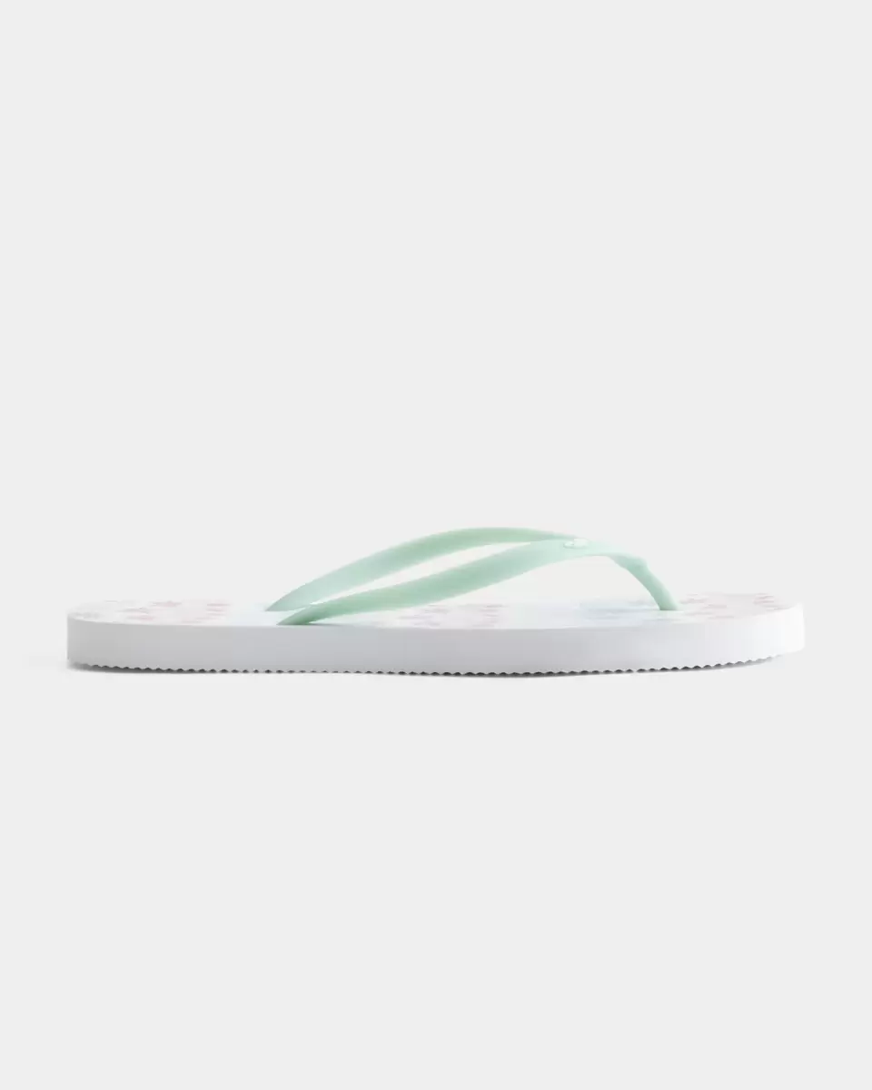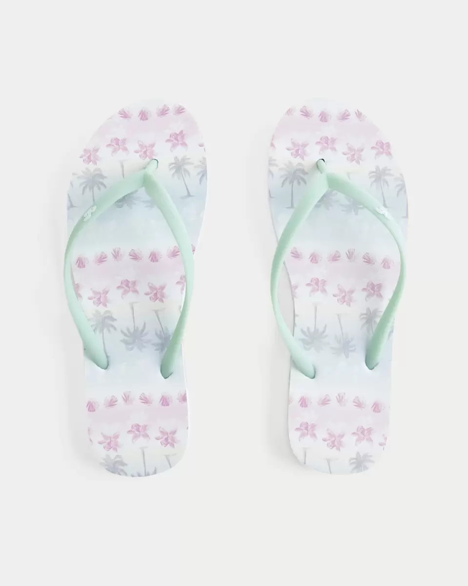 Urocze klapki z miękką wkładką i gumową cholewką. Detale z logo i grafika plażowa.