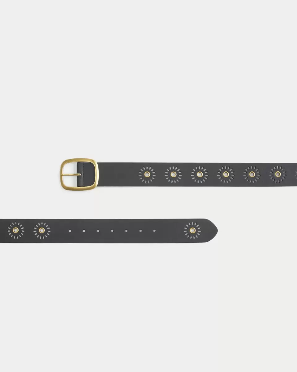 Ten uroczy pasek ze sztucznej skóry zdobią promieniste detale i metalowe przelotki. Metalowa klamra. Produkt importowany.