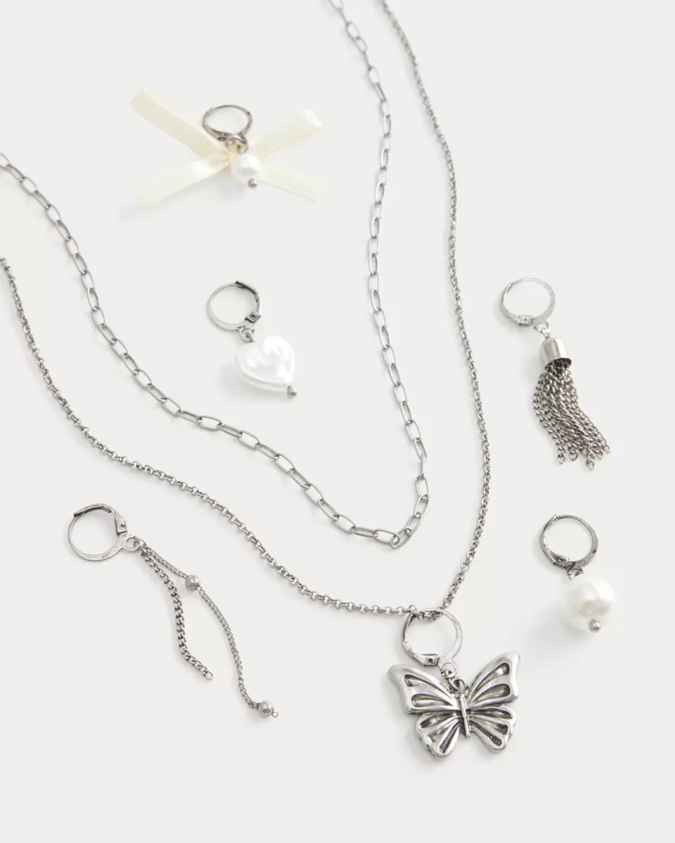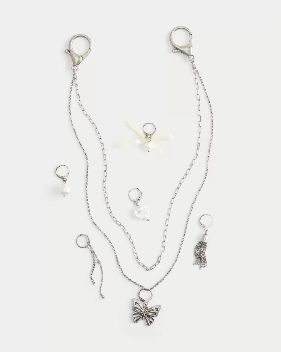 Zestaw uroczych metalowych zawieszek z plastikowymi perłowymi detalami.