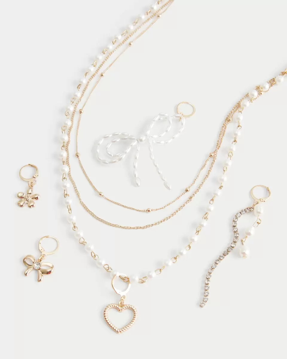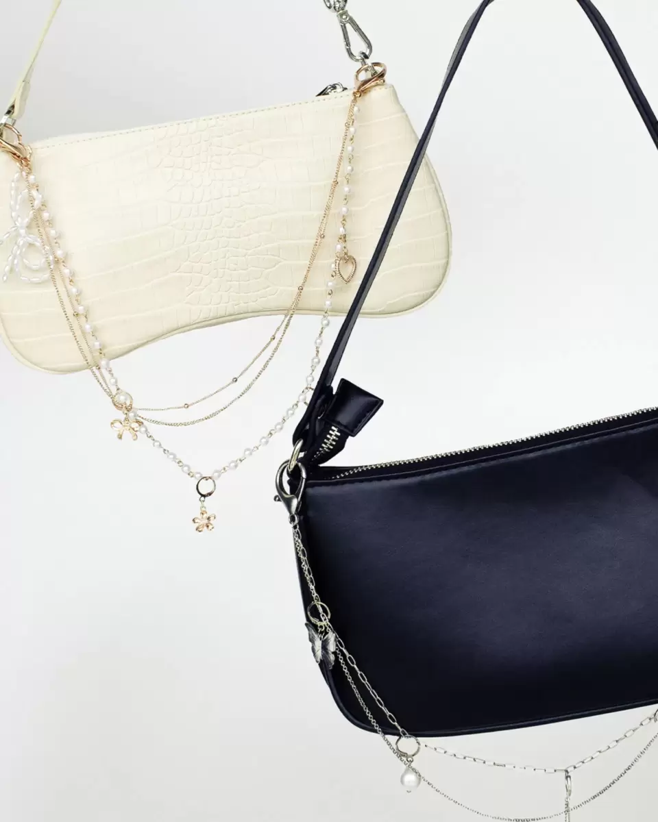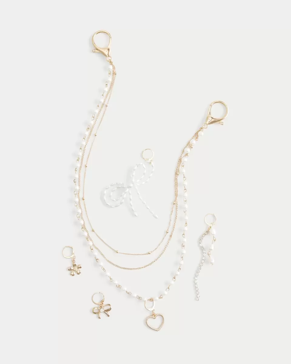 Zestaw uroczych metalowych zawieszek z plastikowymi perłowymi detalami.