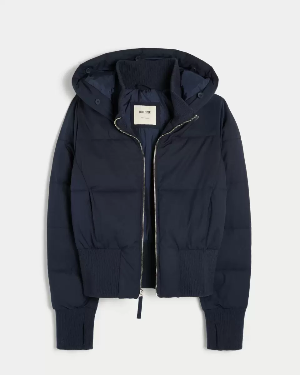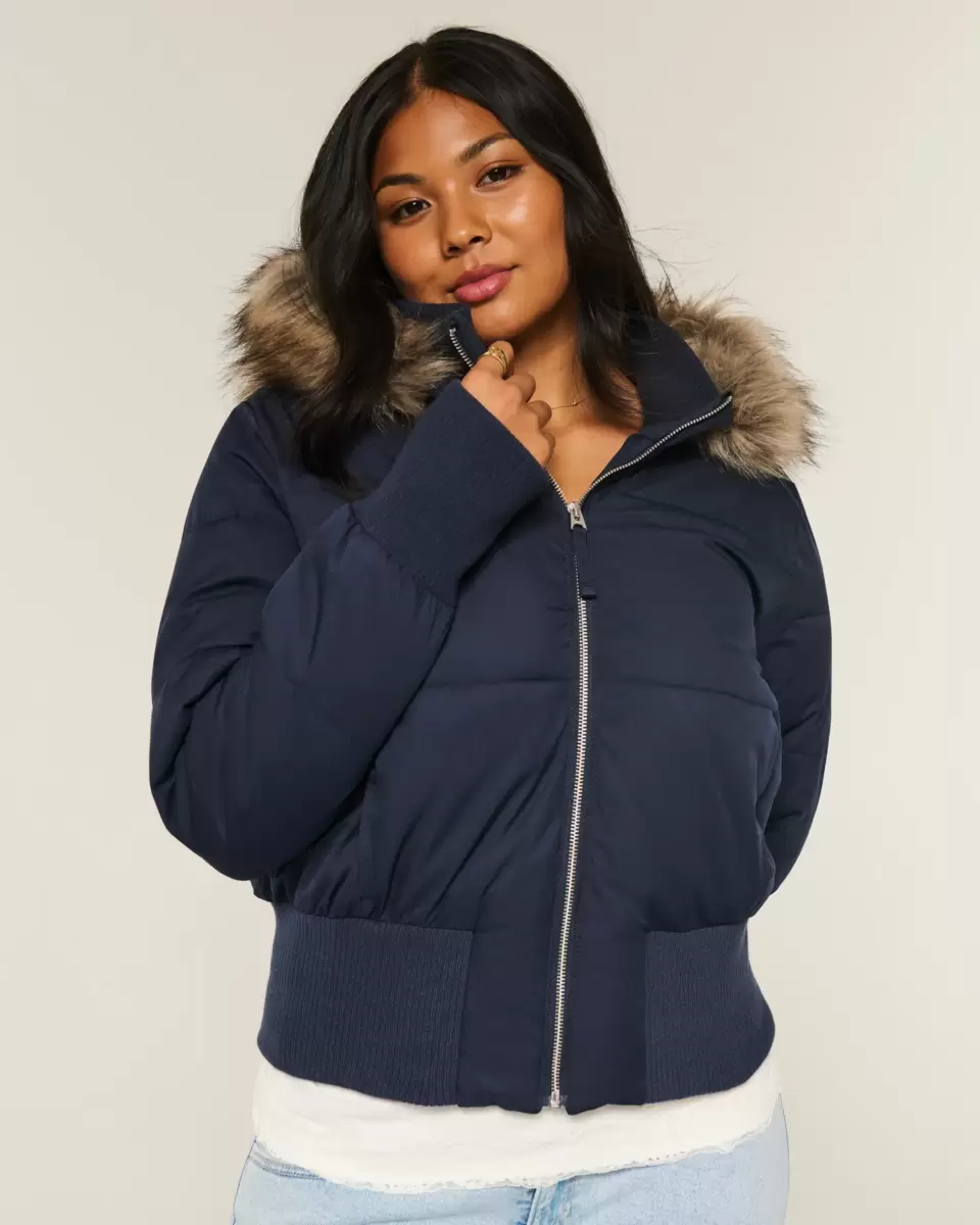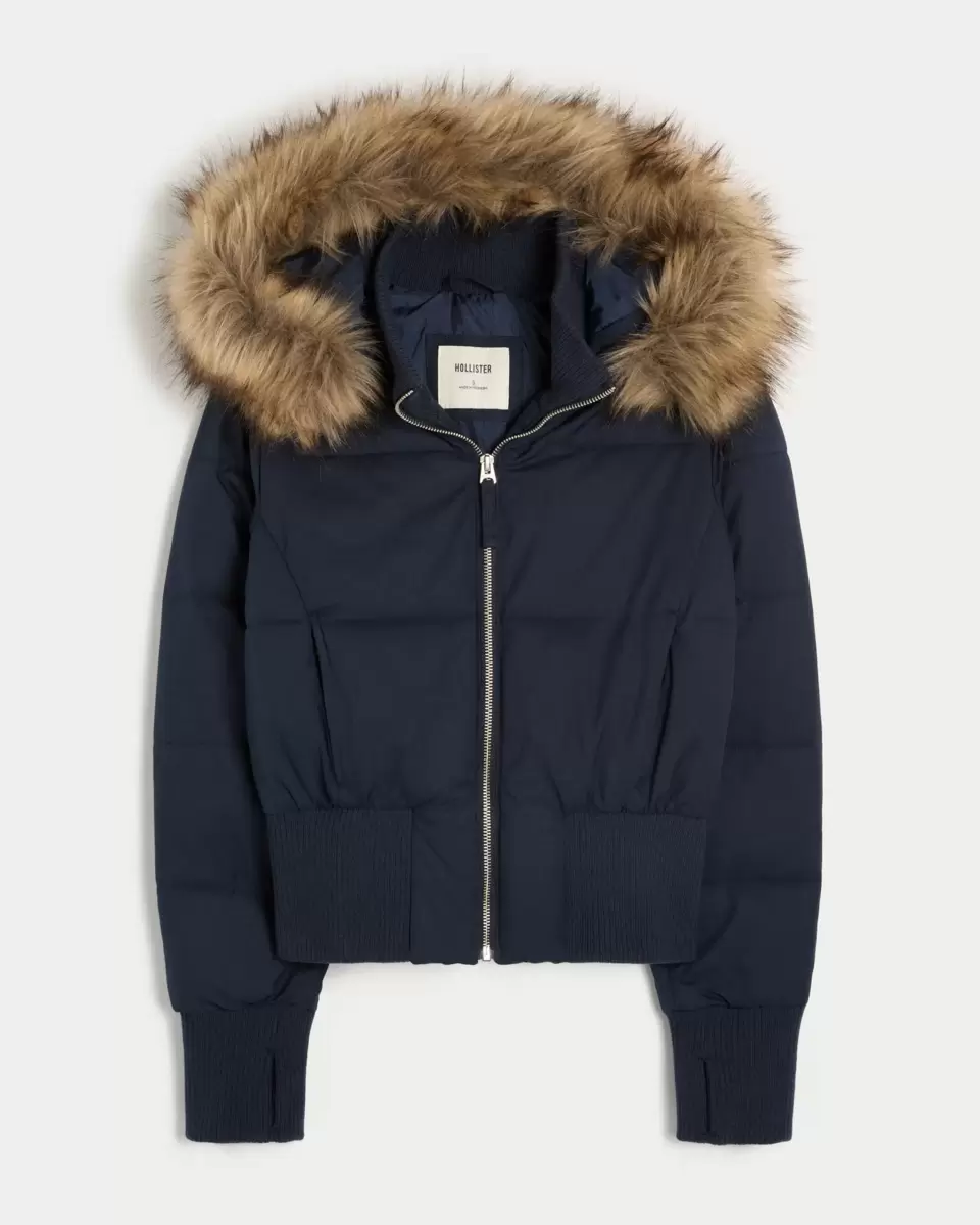 Przytulna, puchowa kurtka typu bomber z pikowanymi kanałami, ściągaczami u dołu i kapturem obszytym sztucznym futerkiem. Kołnierz typu golf, otwory na kciuki w mankietach rękawów, zapięcie na suwak, kieszenie. Importowane.
