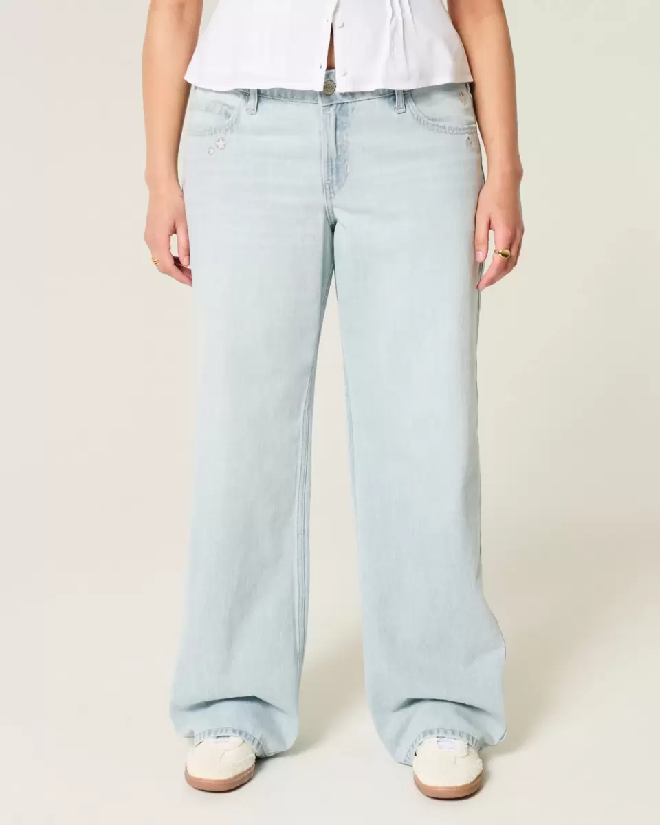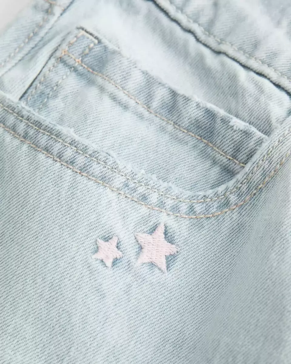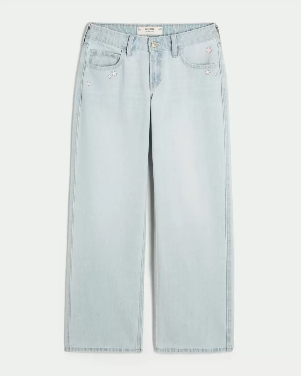 Wygodne jeansy z niskim stanem i luźnymi nogawkami. Lekkie pranie, haft w gwiazdki, przetarcia i zagniecenia. Importowane.