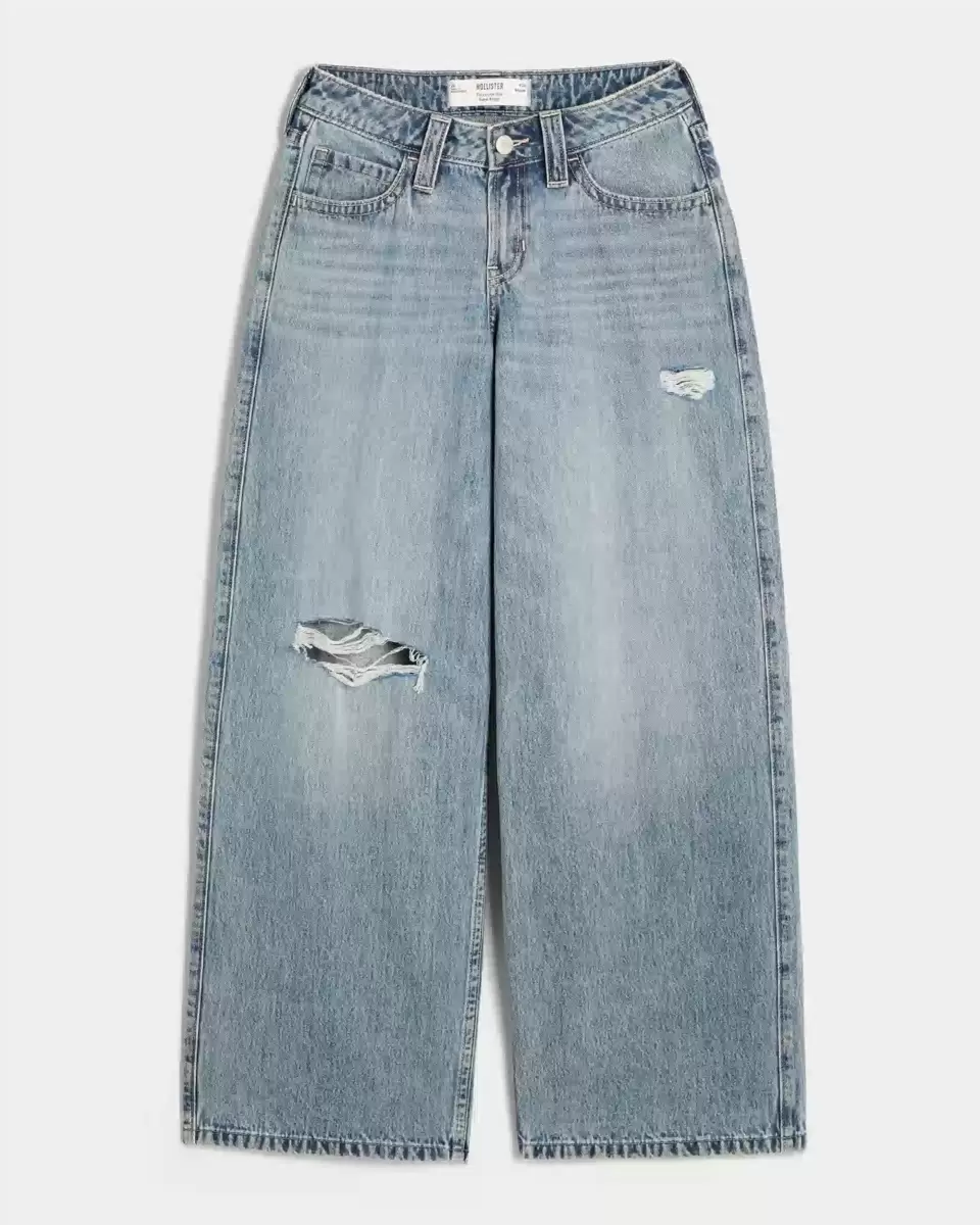 Wygodne jeansy z niskim stanem i bardzo luźnymi nogawkami. Średnio sprane, z rozdarciami, przetarciami i zagnieceniami. Importowane.
