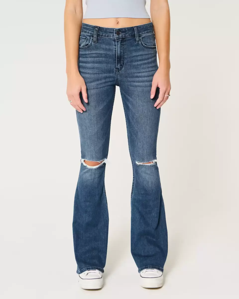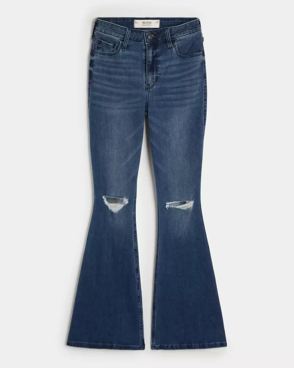 Te jeansy o średnim stopniu sprania, z atrakcyjnym wysokim stanem, mają rozszerzane nogawki w stylu retro, przetarcia, przetarcia i przetarcia. Wykonane z niezwykle wygodnego, elastycznego denimu. Importowane.