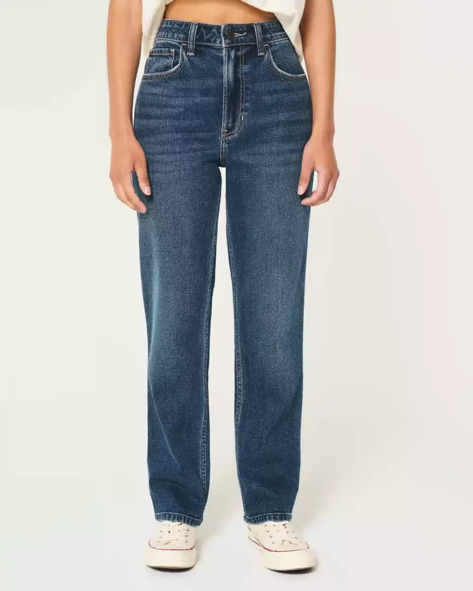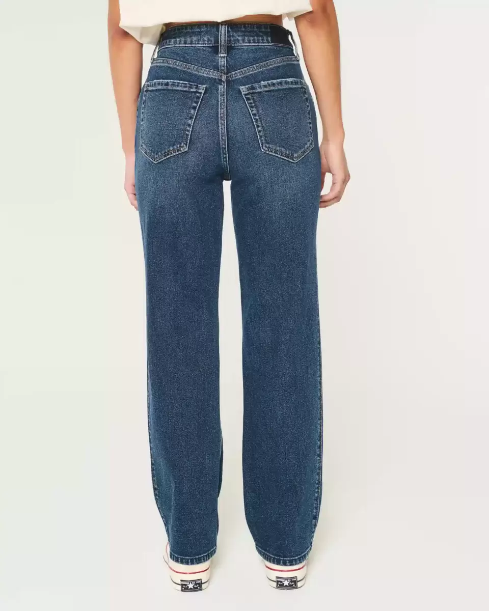 Ultrawygodne jeansy w ciemnym odcieniu z przetarciami i przetarciami oraz bardzo wysokim stanem. Prosta nogawka.