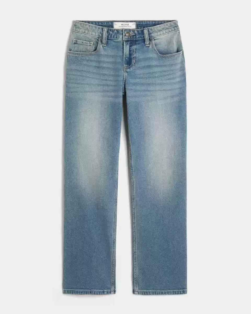 Ultrawygodne jeansy z denimu o średnim stopniu sprania, z niskim stanem i luźną, prostą nogawką. Przetarcia i przetarcia. Importowane.