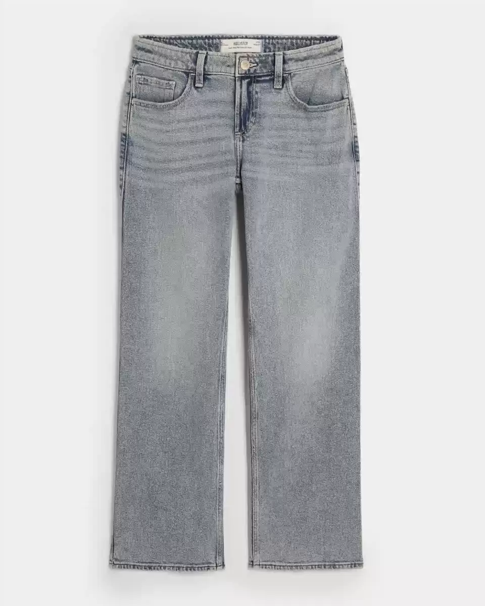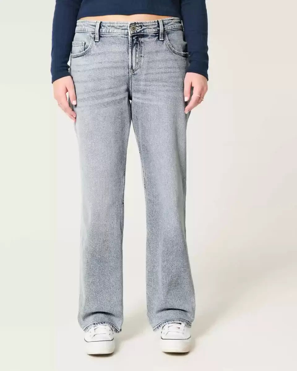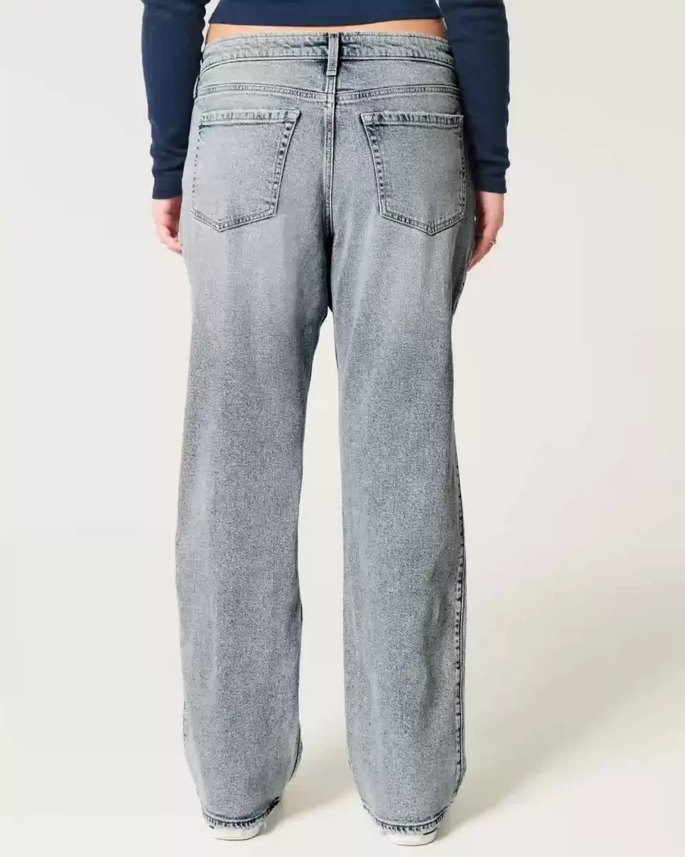 Ultrawygodne jeansy z denimu Vintage Stretch, z niskim stanem i luźną, prostą nogawką. Średnio sprane, z przetarciami i przetarciami. Importowane.