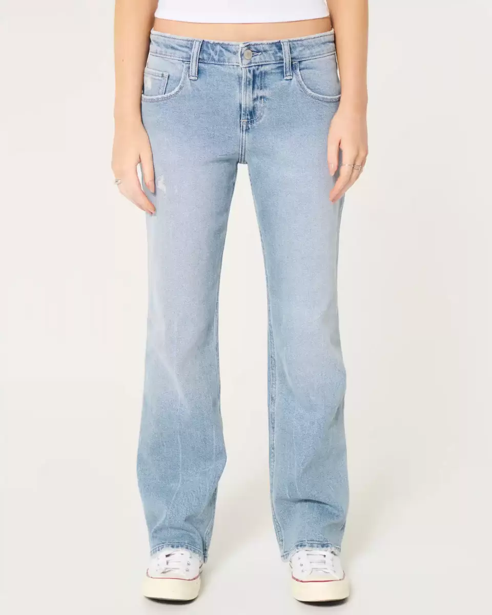 Jeansy z niskim stanem, przetarciami, średnim stanem i prostymi nogawkami