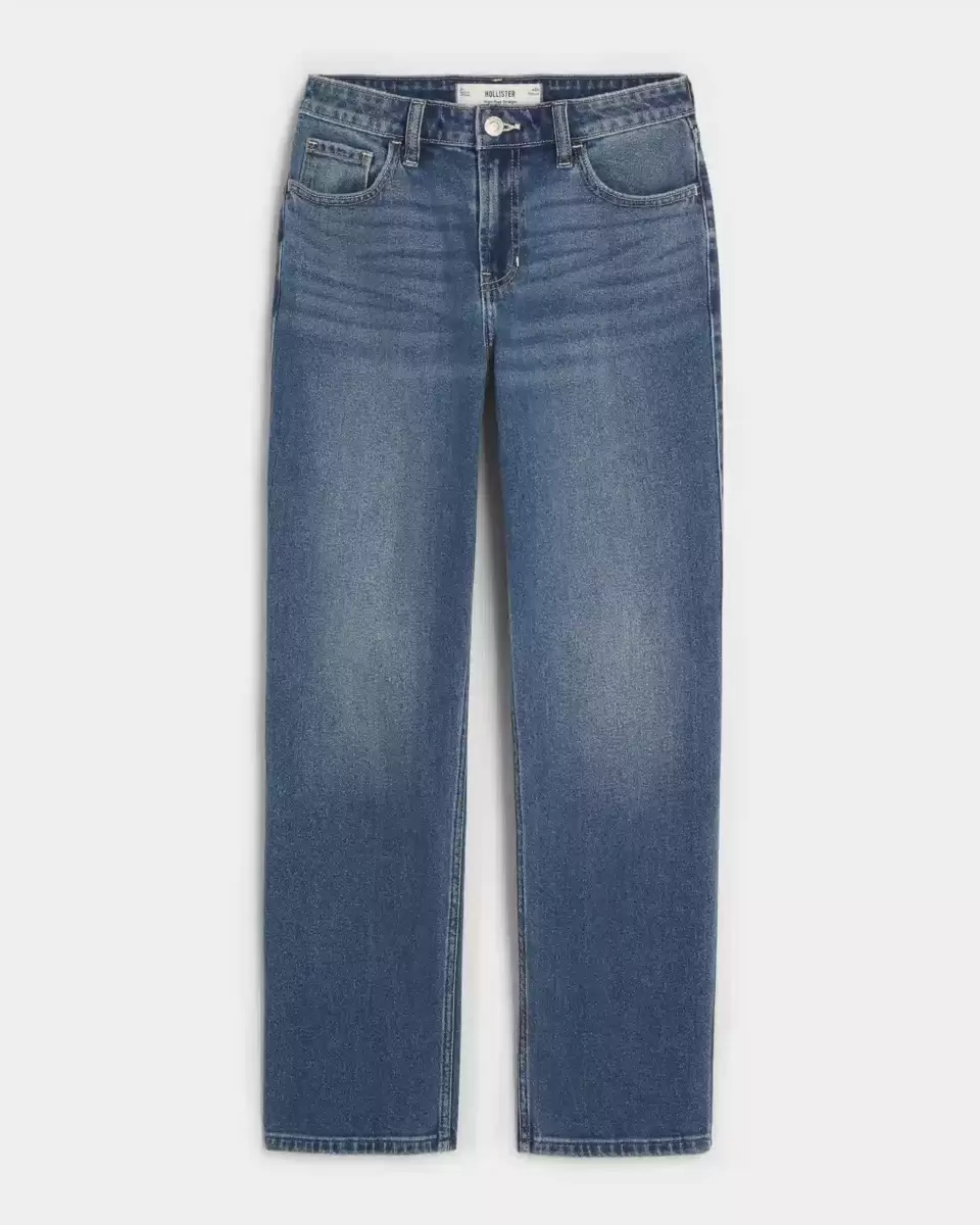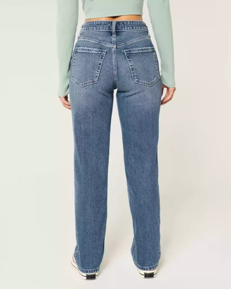 Śliczne i wygodne jeansy w średnim odcieniu z przetarciami i wąsami, zaprojektowane z podkreślającym figurę wysokim stanem i prostą nogawką. Importowane.