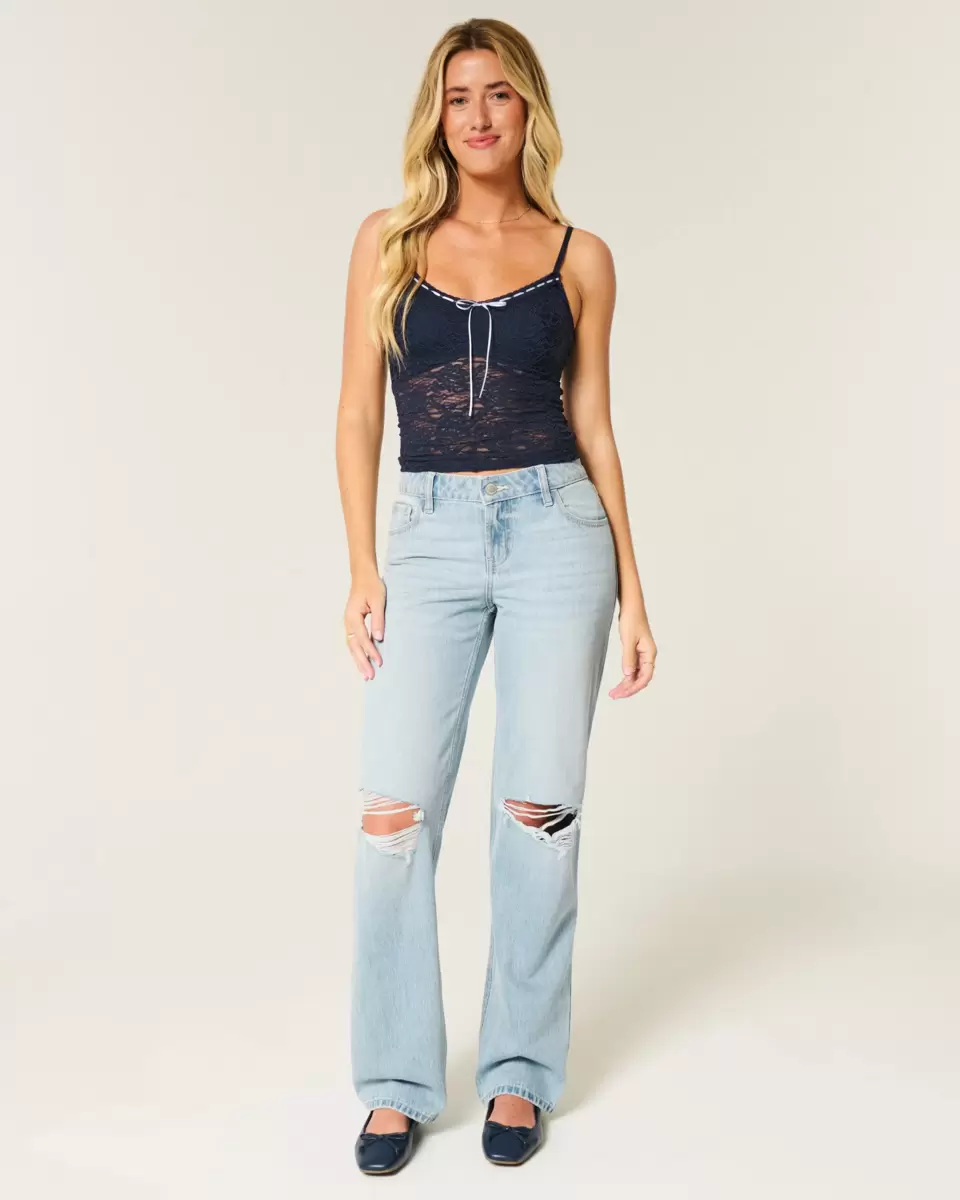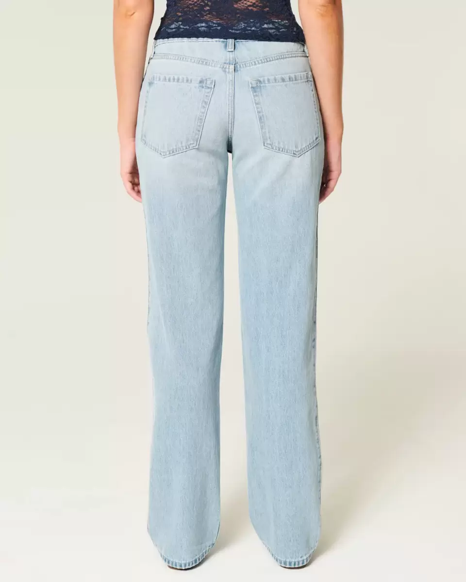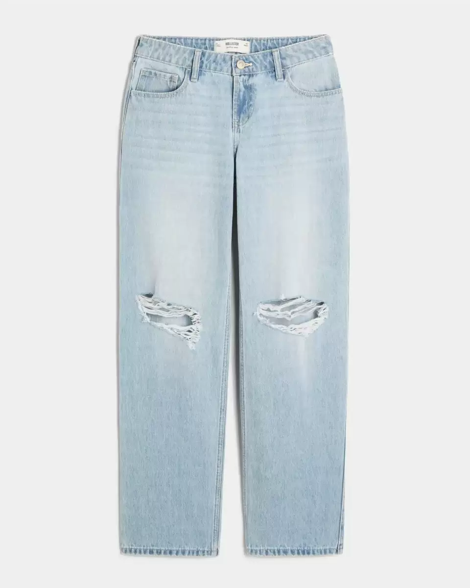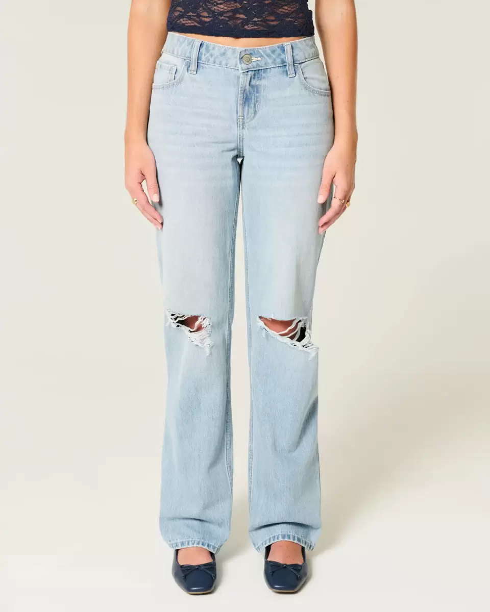 Wygodne jeansy z niskim stanem i luźnymi nogawkami. Przetarcia, przetarcia, wąsy. Importowane.