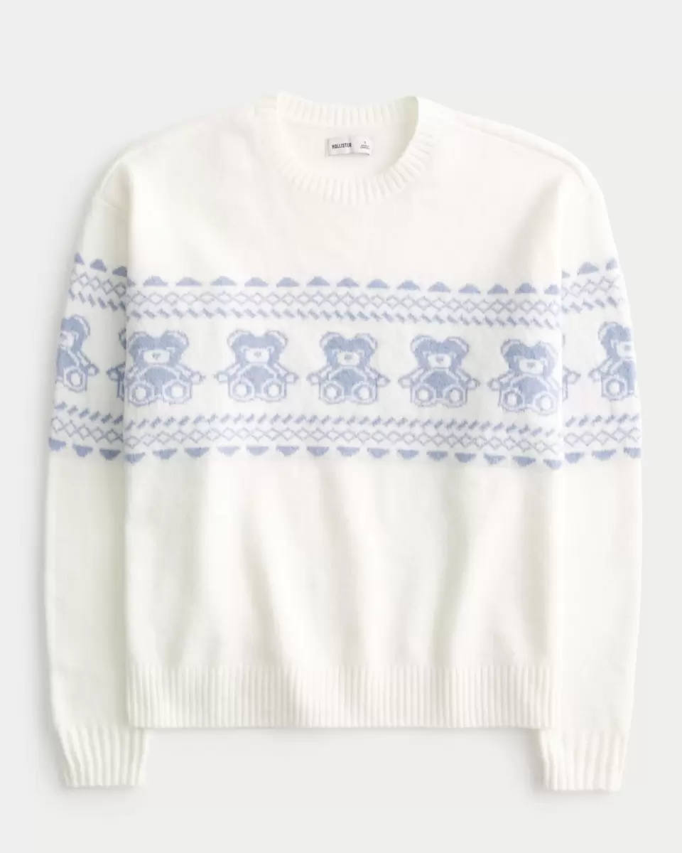 Supermiękki sweter z niesamowicie przytulnej dzianiny, z uroczym, intarsjowanym motywem misia. Okrągły dekolt, długie rękawy, ściągacze. Luźny krój. Importowane.