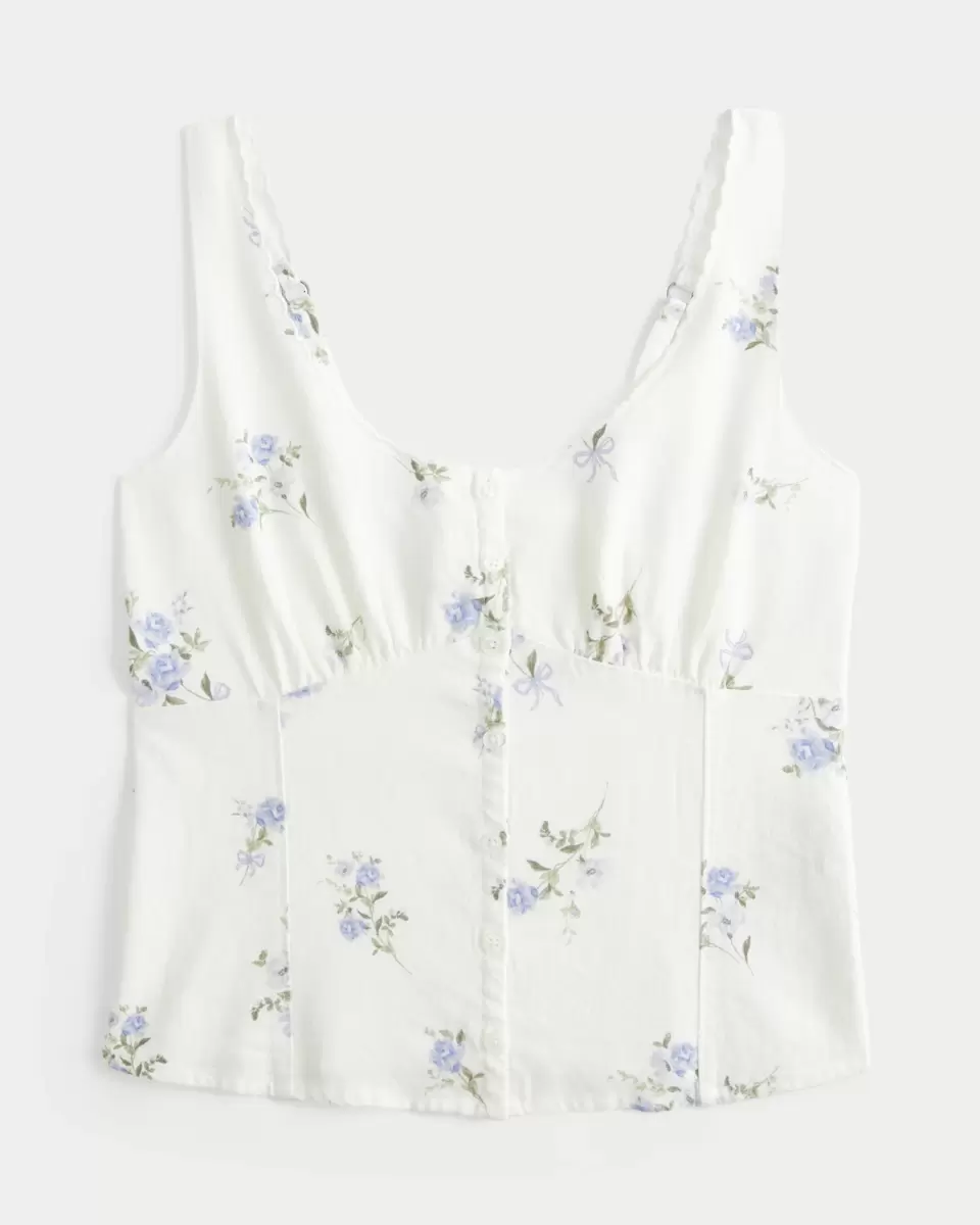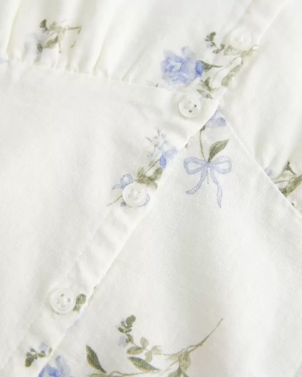 Ta śliczna bluzka ma piękne haftowane detale i falbankowe wykończenie na ramiączkach, okrągły dekolt i zapięcie na guziki. Miękkie marszczenie na plecach. Dopasowany krój. Importowane.