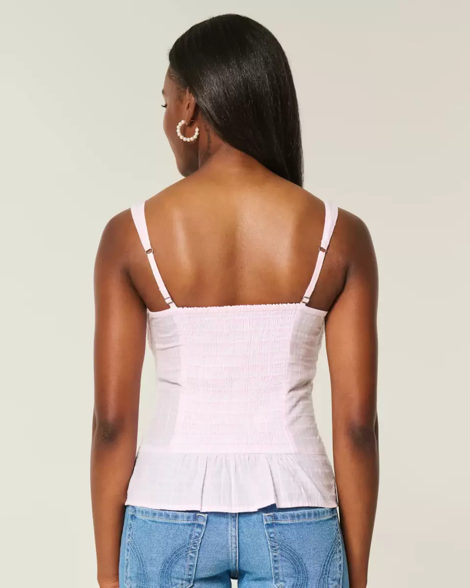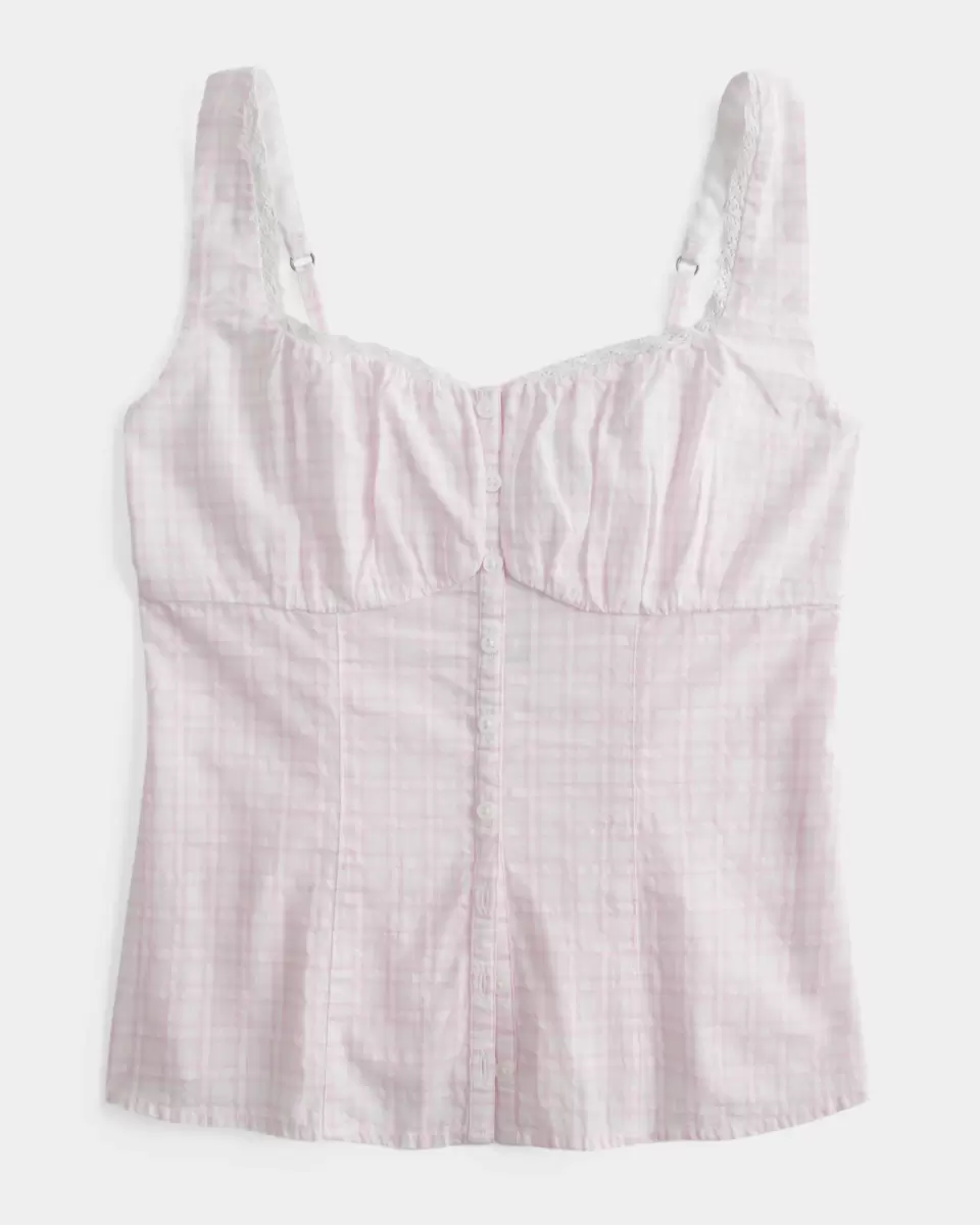 Ta urocza bluzka popelinowa ma zapięcie na guziki i koronkowe wykończenie wzdłuż dekoltu. Miękka, teksturowana tkanina, regulowane ramiączka, idealnie sprawdzi się zarówno na co dzień, jak i na elegancko! Dopasowany krój. Importowane.