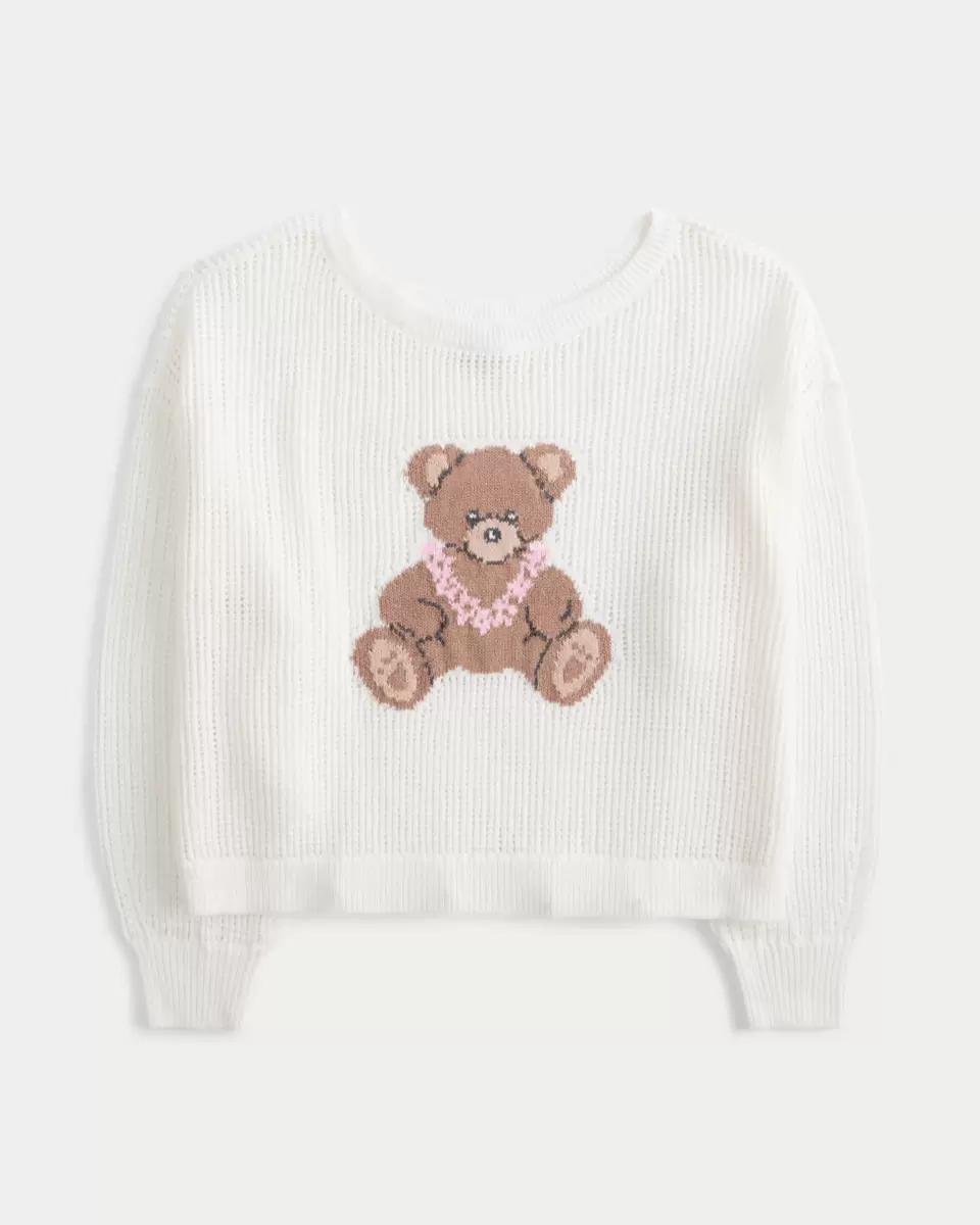 Przytulny i supermiękki sweterek wykonany z teksturowanego materiału z przeszyciami i ozdobiony uroczym nadrukiem misia. Luźny dekolt można nosić na jednym ramieniu. Ściągacze, długi rękaw.