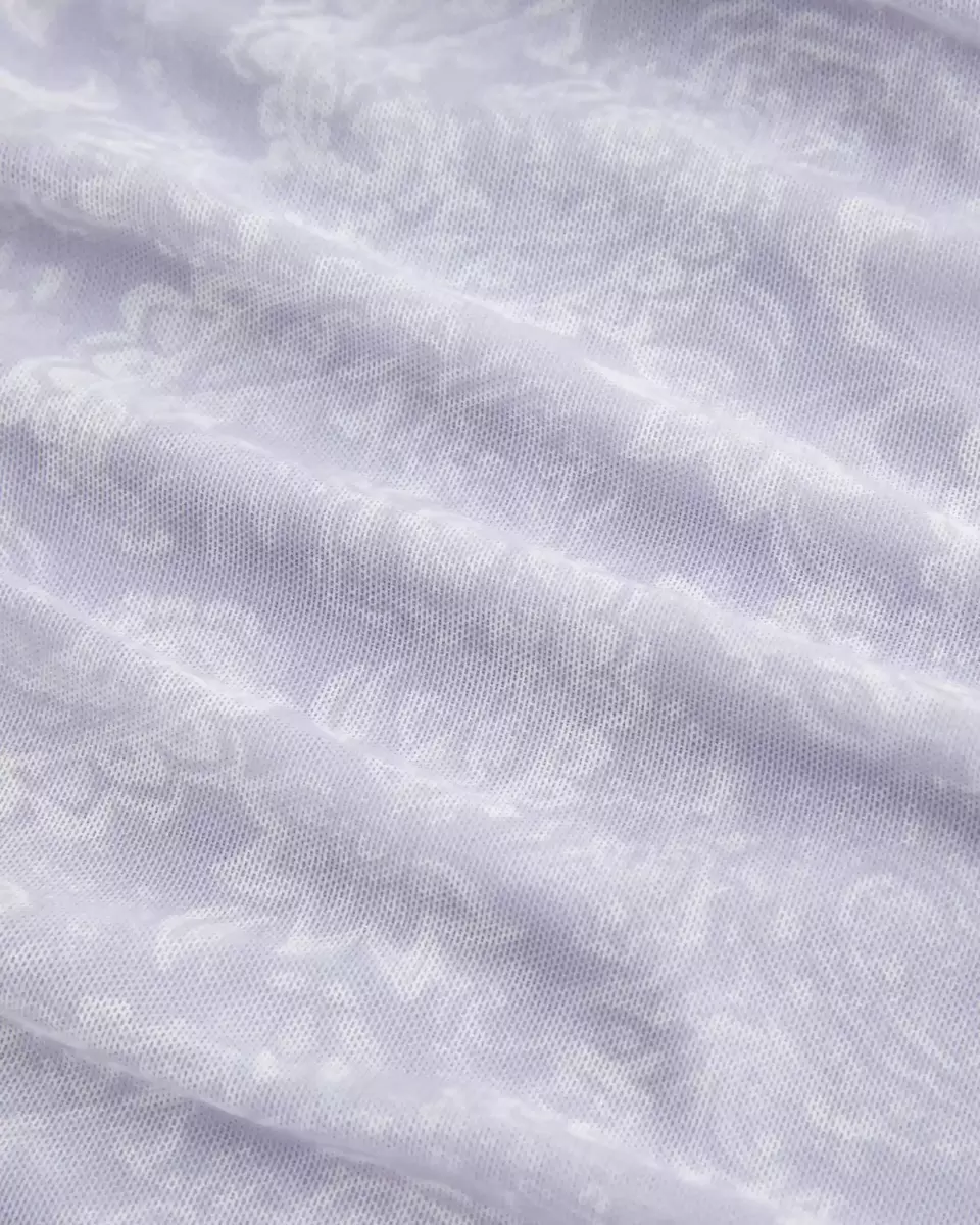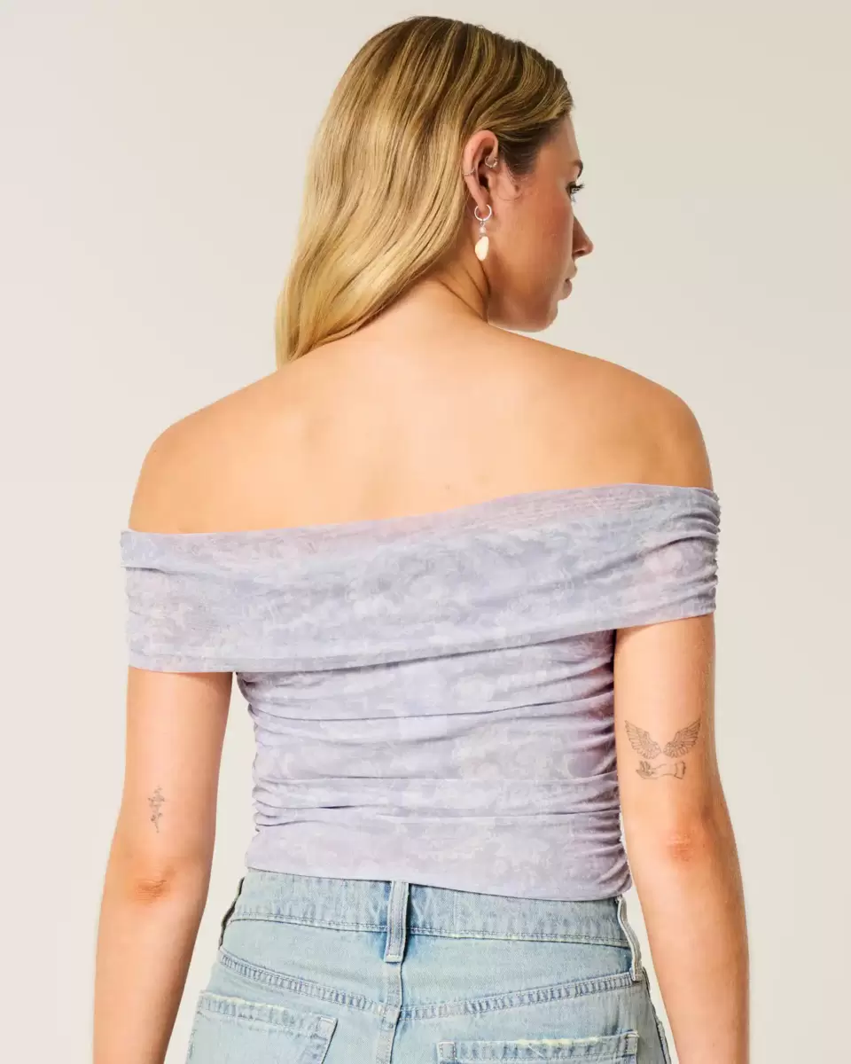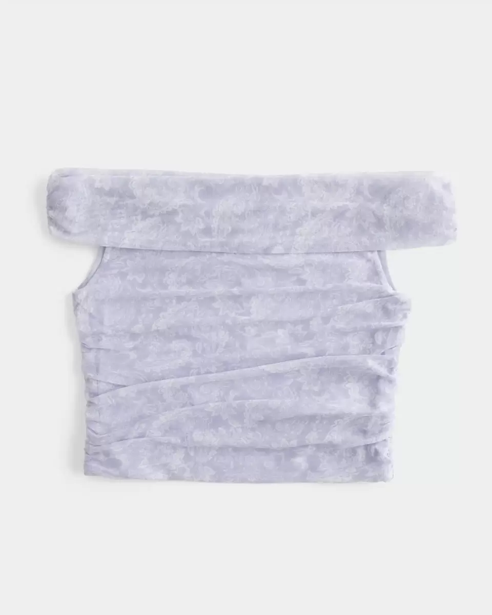 Ten ładny i supermiękki top jest wykonany z siateczki i ma wywinięty dekolt odsłaniający ramiona. Marszczenia na bocznych szwach, podwójna podszewka. Dopasowany krój. Importowane.