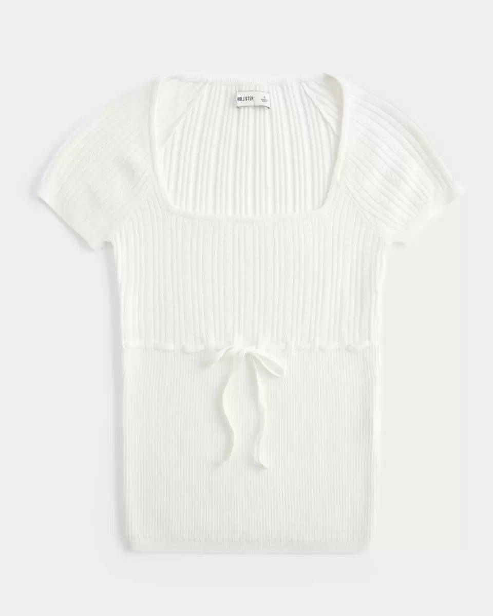 Uroczy i supermiękki sweterek z krótkim rękawem ma prążkowaną fakturę i wiązanie w talii. Kwadratowy dekolt. Produkt importowany.