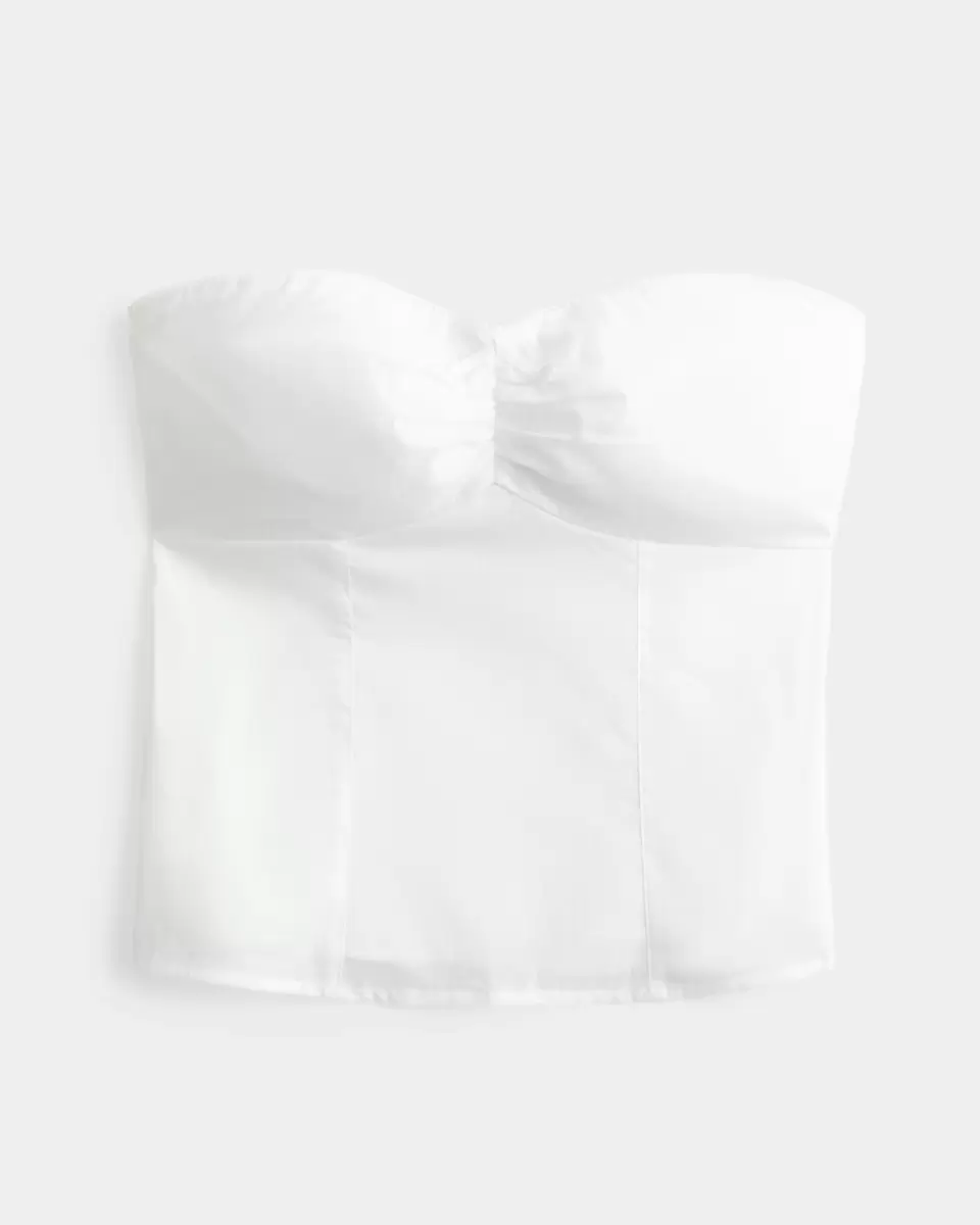 Uroczy, miękki top z marszczeniami na biuście i kokardką na środku dekoltu, a także śliczną koronkową lamówką pikot wzdłuż dekoltu. Bez ramiączek. Dopasowany krój. Importowane.