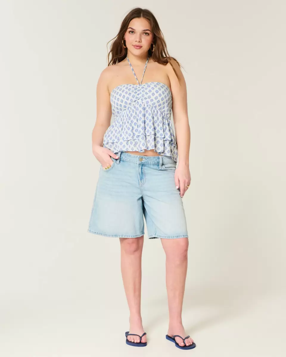 Lekka i supermiękka, ta bluzka typu babydoll bez ramiączek jest wykonana z marszczonego materiału i ma dwuwarstwowy dół. Wiązanie pośrodku pozwala nosić ją bez ramiączek lub jako top z halterem. Miękkie marszczenia na plecach. Łatwe dopasowanie. Importowane.