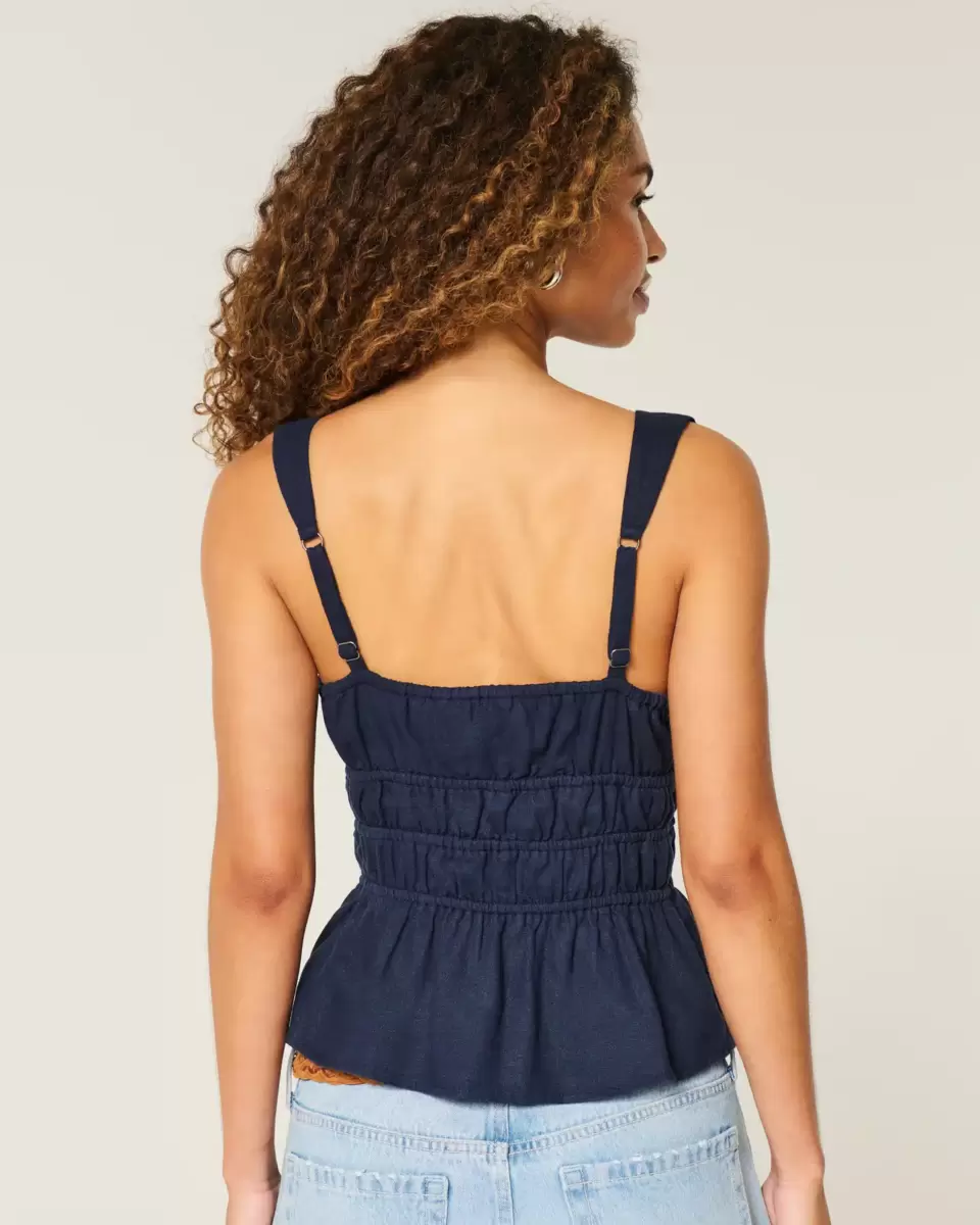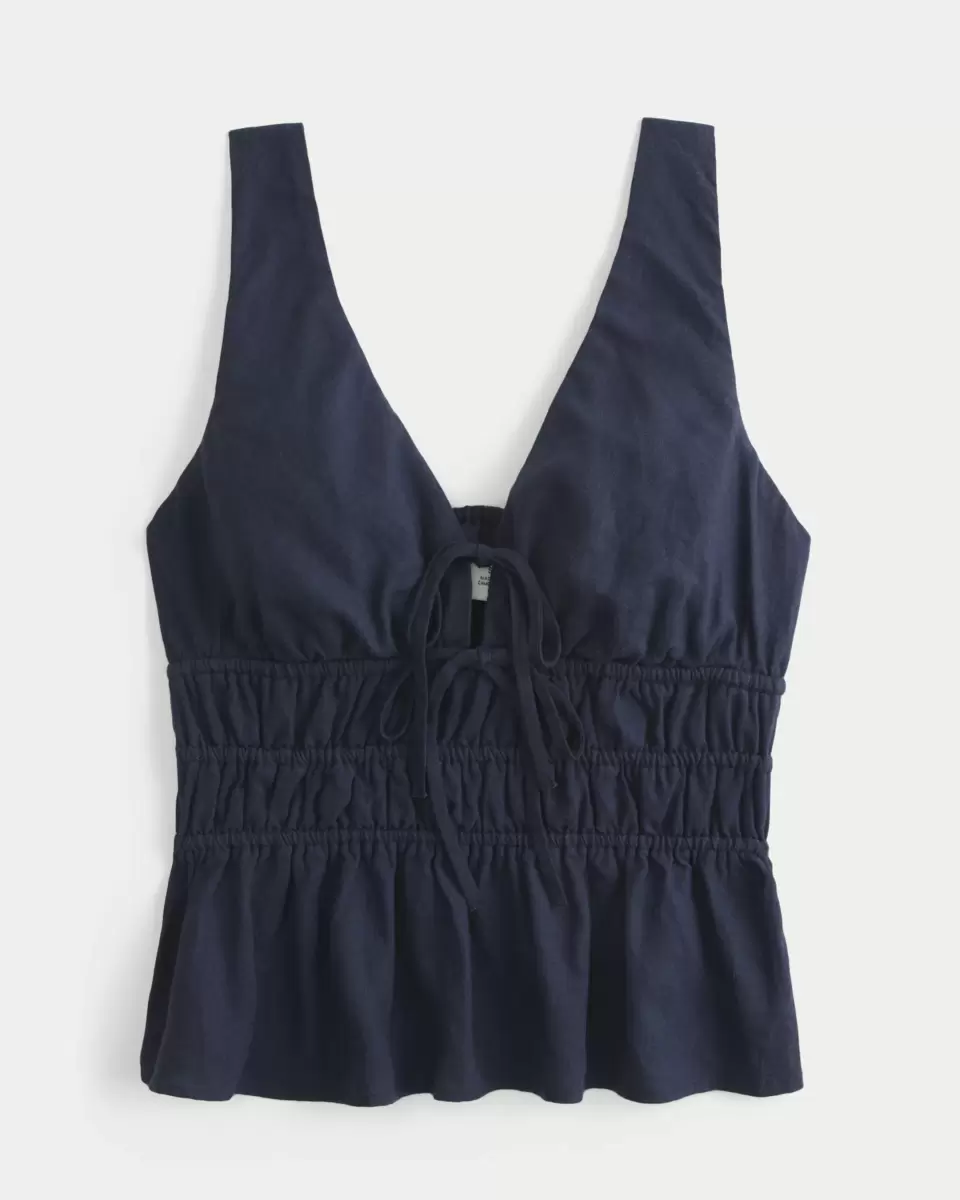 Uroczy top z baskinką z miękkiej mieszanki lnu, z wiązaniem z przodu i wcięciem w talii. Dekolt w serek. Dopasowany krój. Produkt importowany.