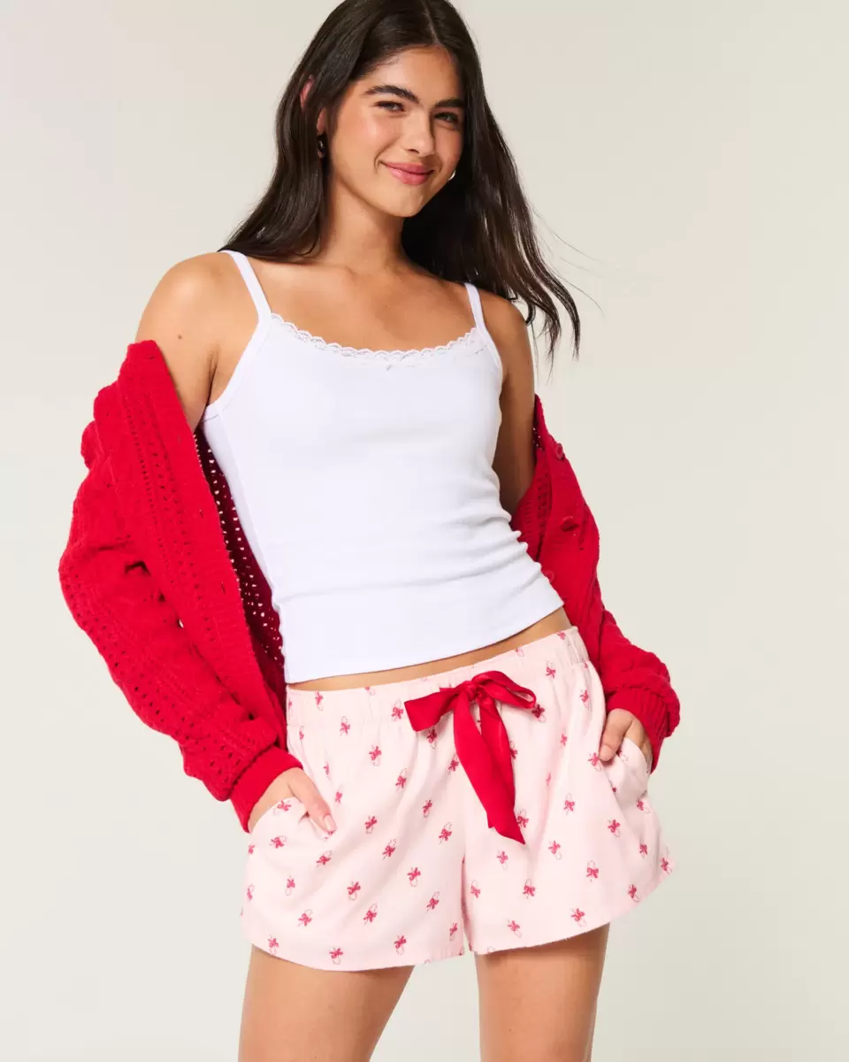 Supermiękkie flanelowe spodenki do spania z wiązaniem w pasie i kieszeniami. Wzór świąteczny na całej powierzchni. Produkt importowany.
