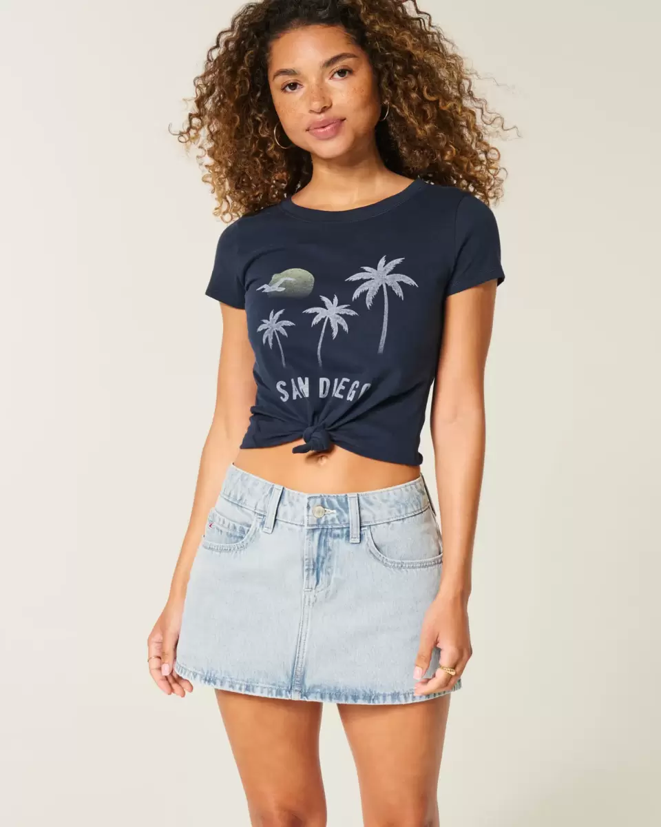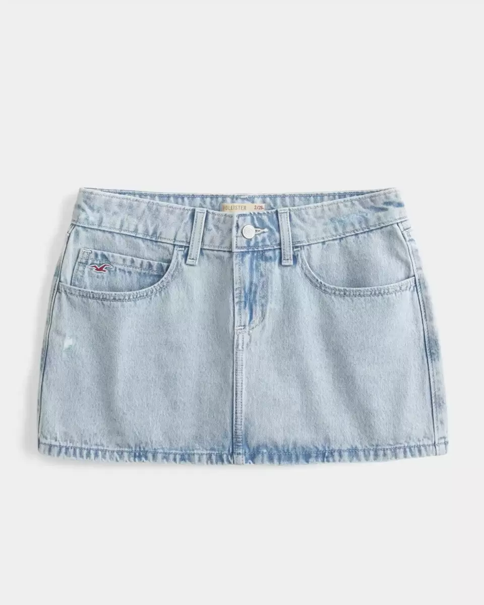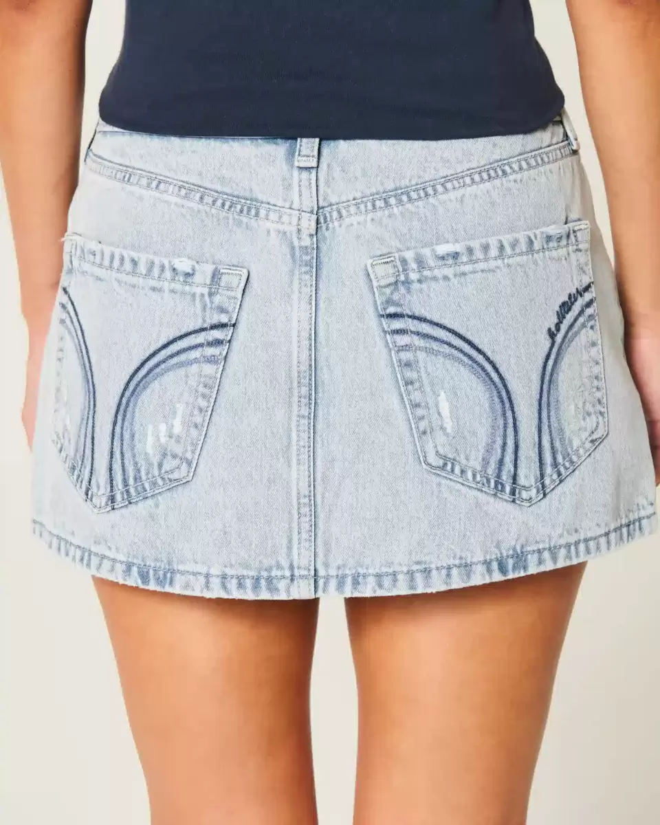 Urocza mini spódniczka z jeansu w jasnym kolorze, z niskim stanem i wbudowanymi szortami z kieszenią na telefon. Importowane.