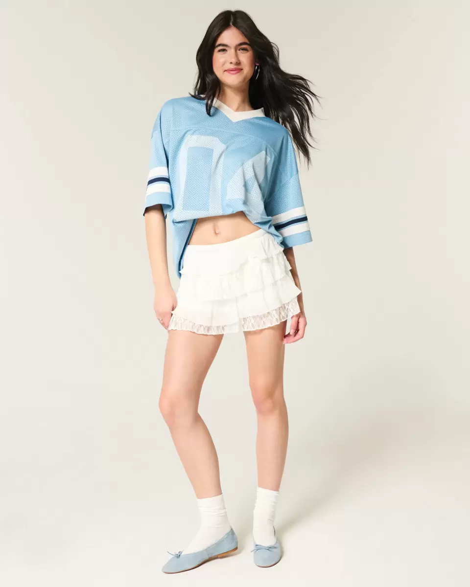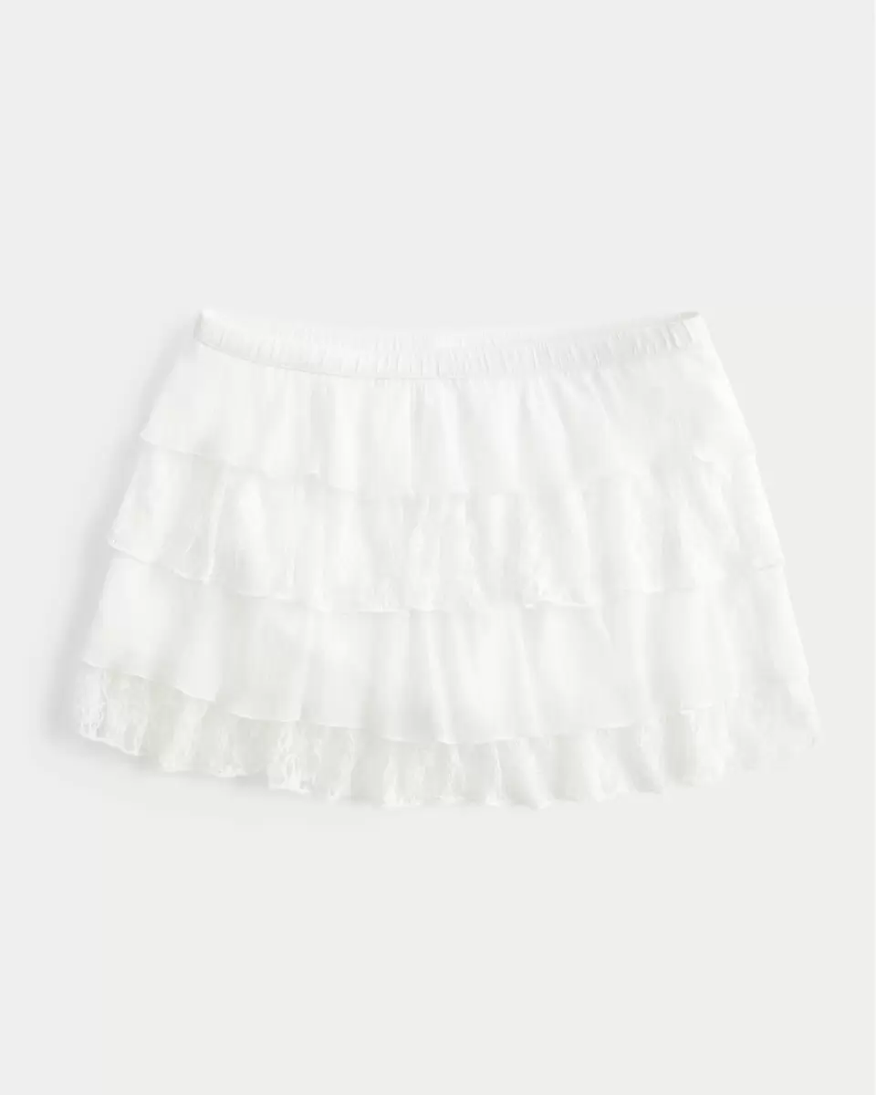 Urocza i wygodna mini spódniczka z wbudowanymi szortami i ściągaczem w pasie. Warstwowe wykończenie z szyfonu i koronki. Importowane.