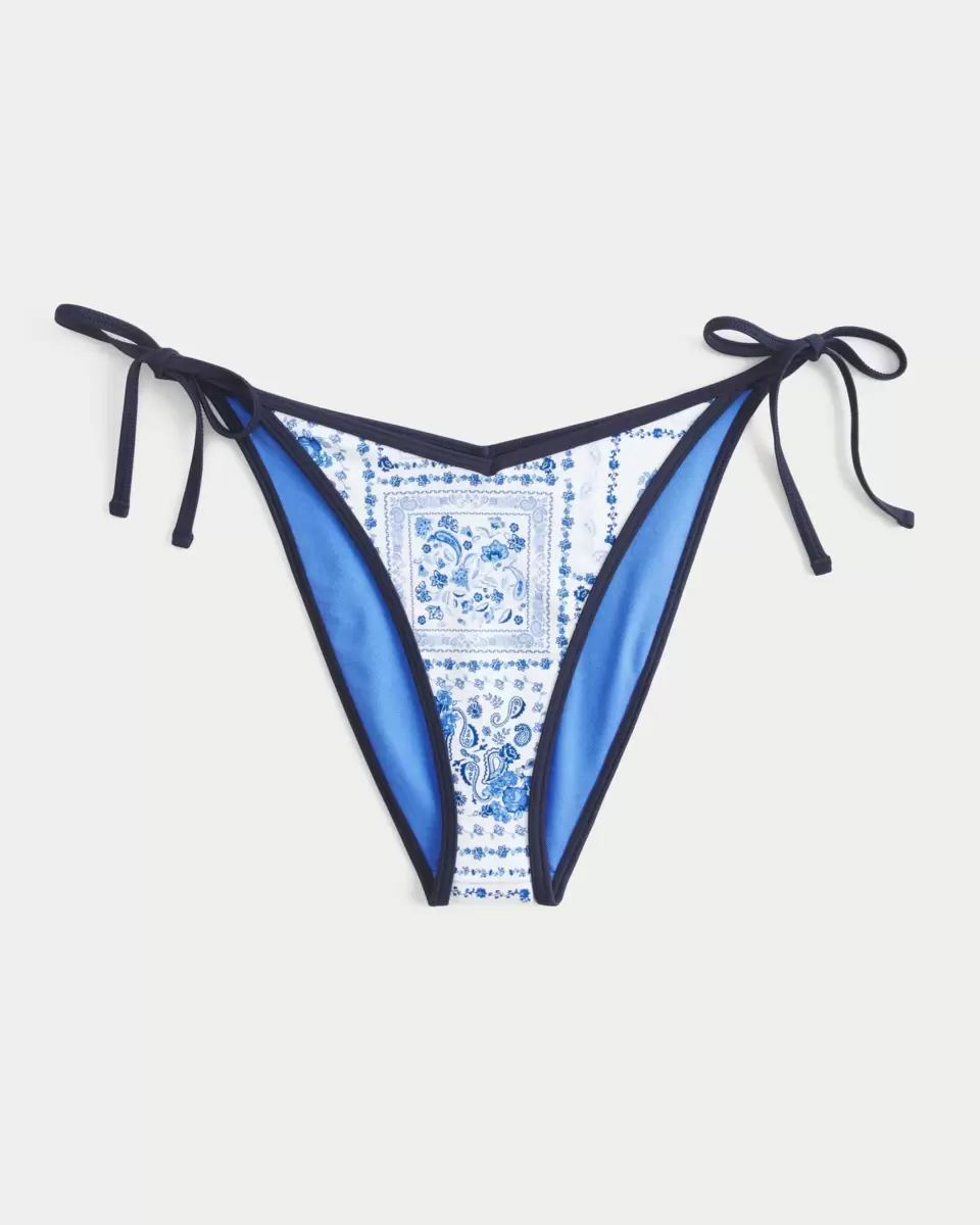 Urocze majtki od bikini z wiązaniami po bokach i wycięciem w szpic. Zapewniają śmiałe krycie. Produkt importowany.