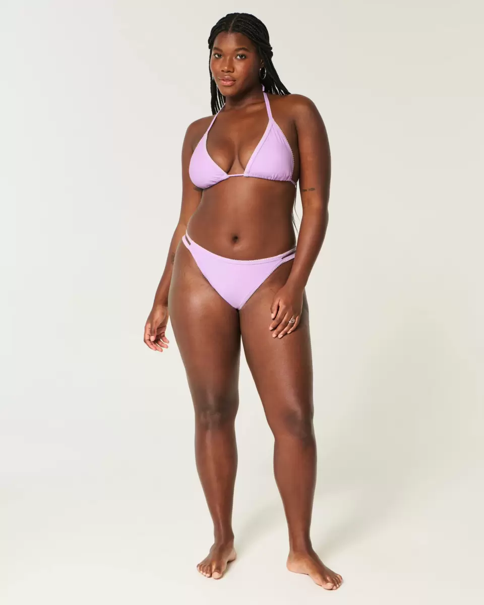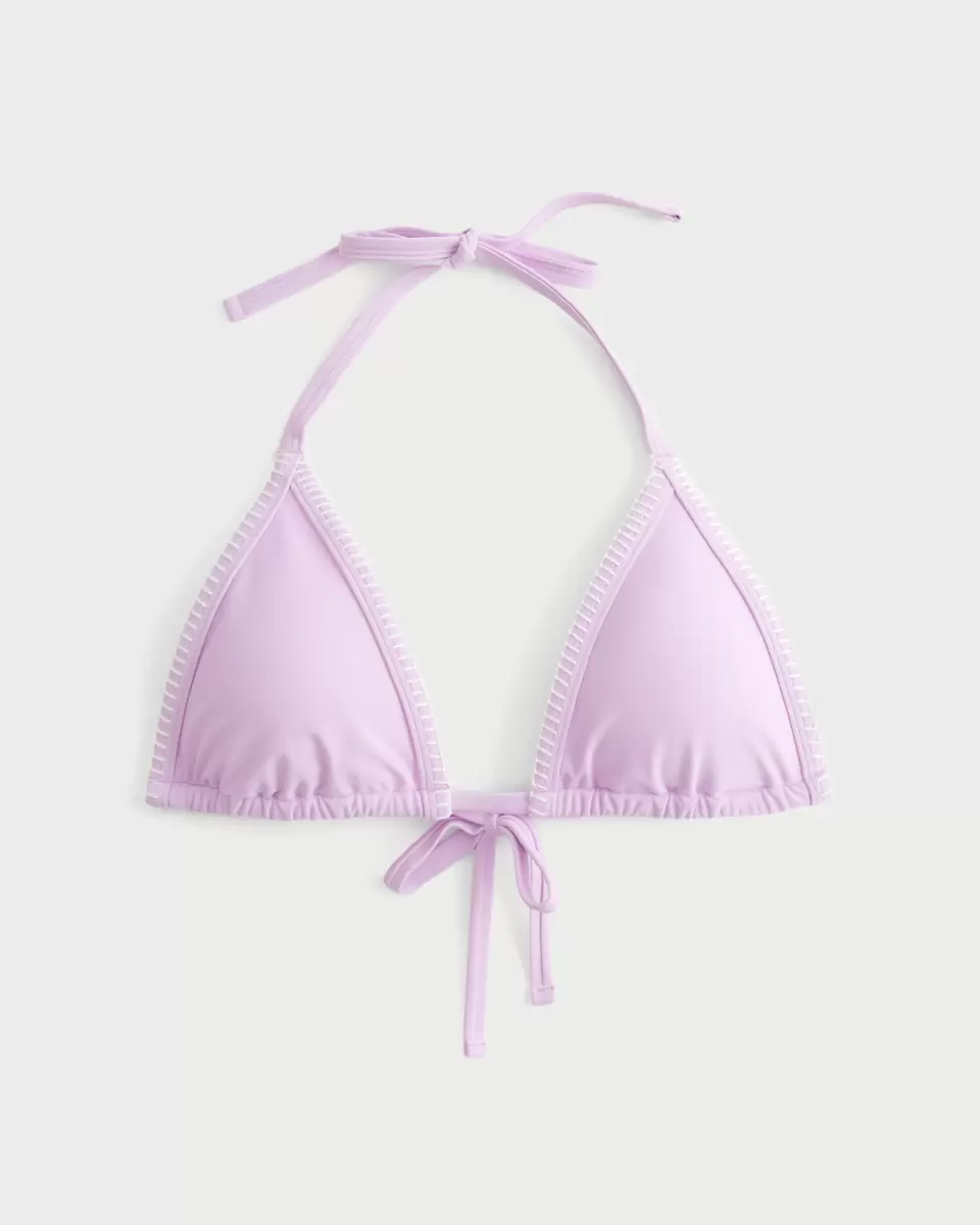 Śliczny i wygodny trójkątny top od bikini wykonany z miękkiego materiału kąpielowego, z zapięciem na plecach, paskami na szyję, wyjmowanymi wkładkami i haftowanymi przeszyciami. Importowane.