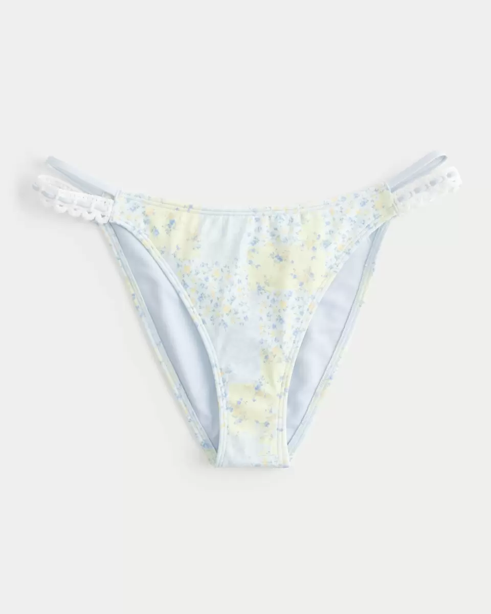 Ładny dół od bikini z miękkiego materiału w stylu szydełkowym. Paski na bokach, wysoko wycięte nogawki, odważne krycie. Produkt importowany.