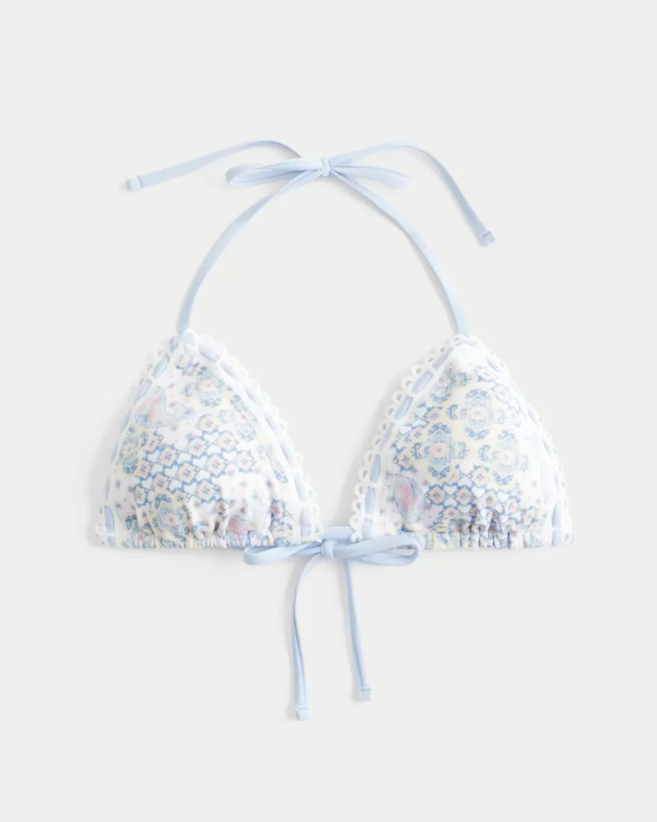 Ten uroczy stanik od bikini wykonany jest z miękkiego materiału do pływania i ma wiązanie, szydełkowe wykończenie oraz wyjmowane wkładki. Klasyczny, trójkątny krój z wiązaniem na szyi.