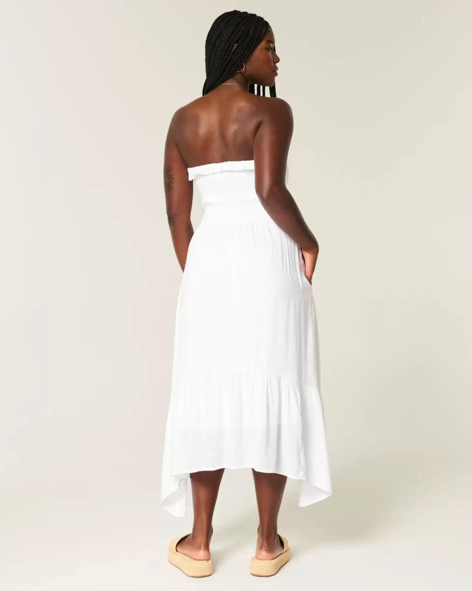 Zwiewna i supermiękka, ta sukienka maxi ma asymetryczny dół i miękki, marszczony gorset. Urocza falbanka przy dekolcie z wiązaniem na środku. Importowane.