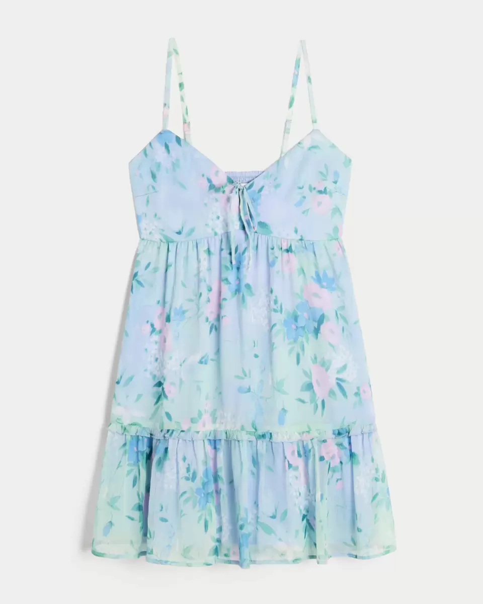 Ta zwiewna, inspirowana festiwalem sukienka mini ma falbaniasty dół i wiązanie na środku dekoltu. Miękkie marszczenia na plecach, regulowane ramiączka. Importowane.