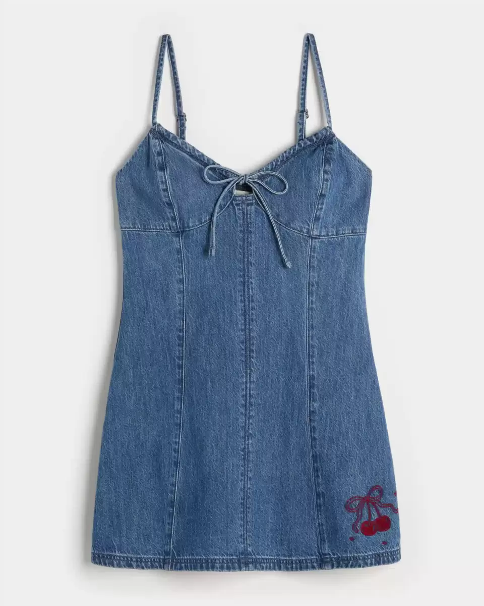 Ta urocza mini sukienka z jeansu wyróżnia się klasycznymi zdobieniami szwów i wiązaniem na środku dekoltu. Regulowane ramiączka i haftowana grafika w kolorze wiśni.