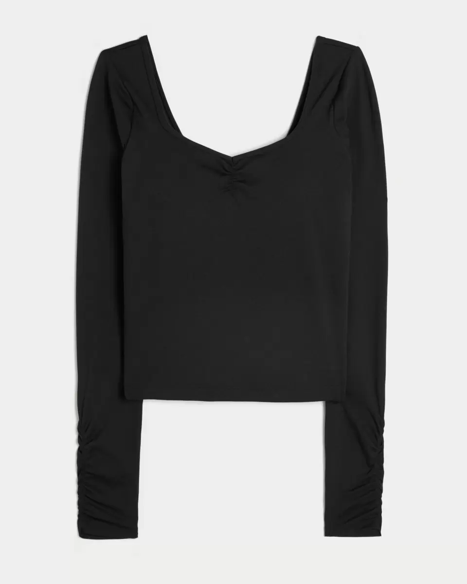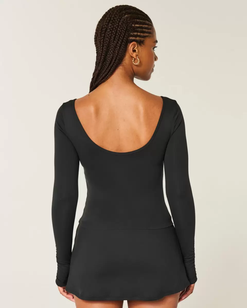 Superwygodna, aktywna koszulka z długim rękawem, wykonana z oddychającego, rozciągliwego w czterech kierunkach, odprowadzającego wilgoć materiału Recharge, o supermiękkim, szczotkowanym wykończeniu. Uroczy dekolt w kształcie serca z marszczeniami, wyjmowane wkładki. Importowane.