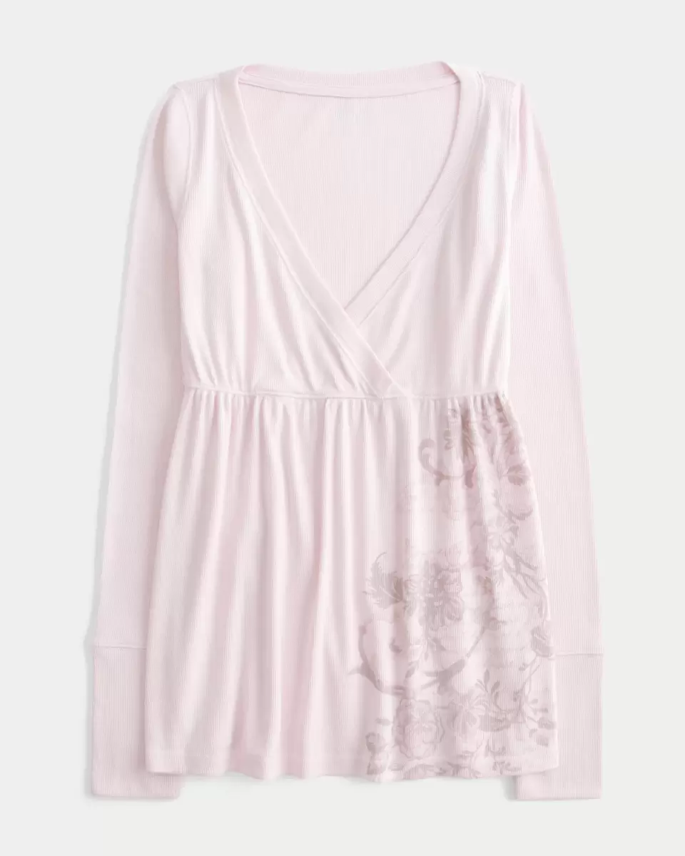 Ta śliczna, supermiękka bluzeczka typu babydoll z graficznym wzorem kwiatowym. Długie rękawy, kopertowy dekolt w serek, luźny dół. Łatwo się układa. Produkt importowany.