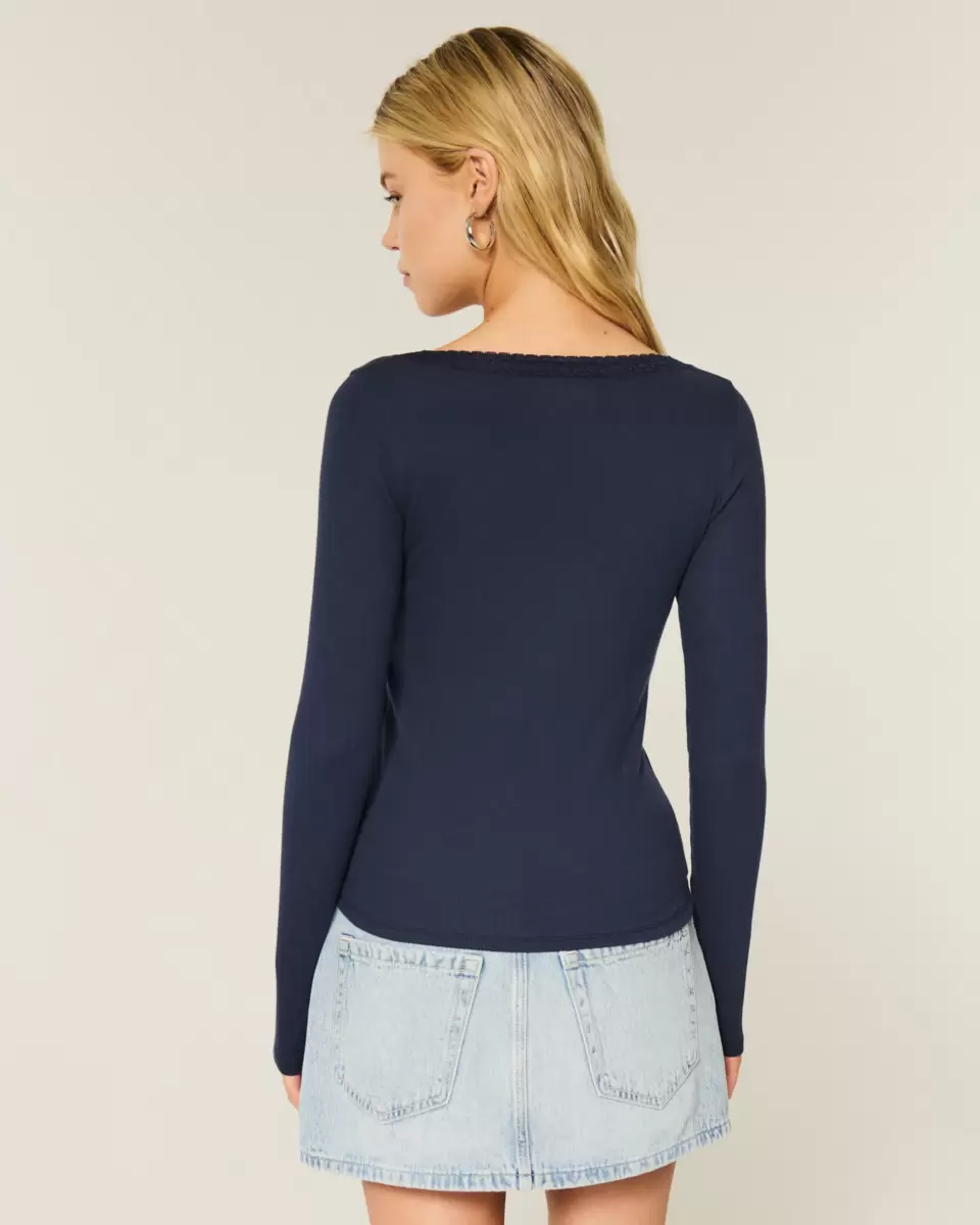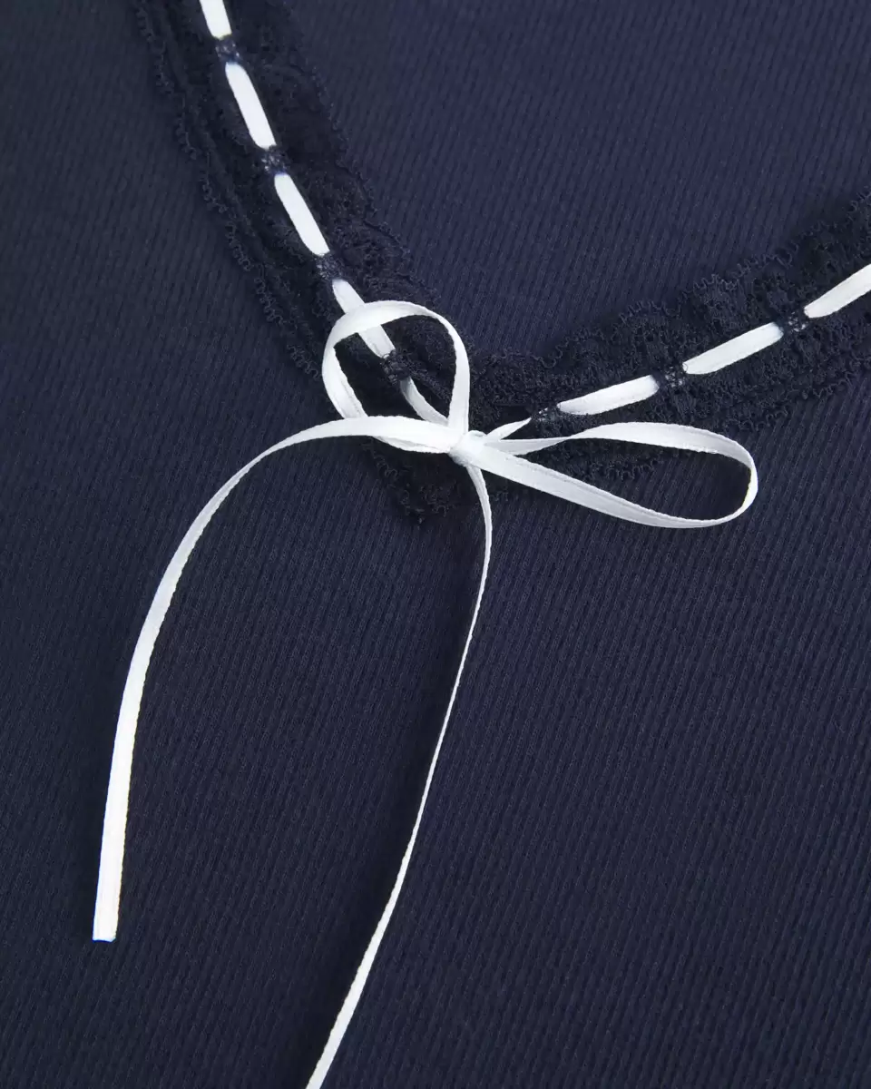 Supermiękki i wygodny top z ładną koronkową lamówką wzdłuż dekoltu i przeplatanym wiązaniem. Długie rękawy. Importowane.