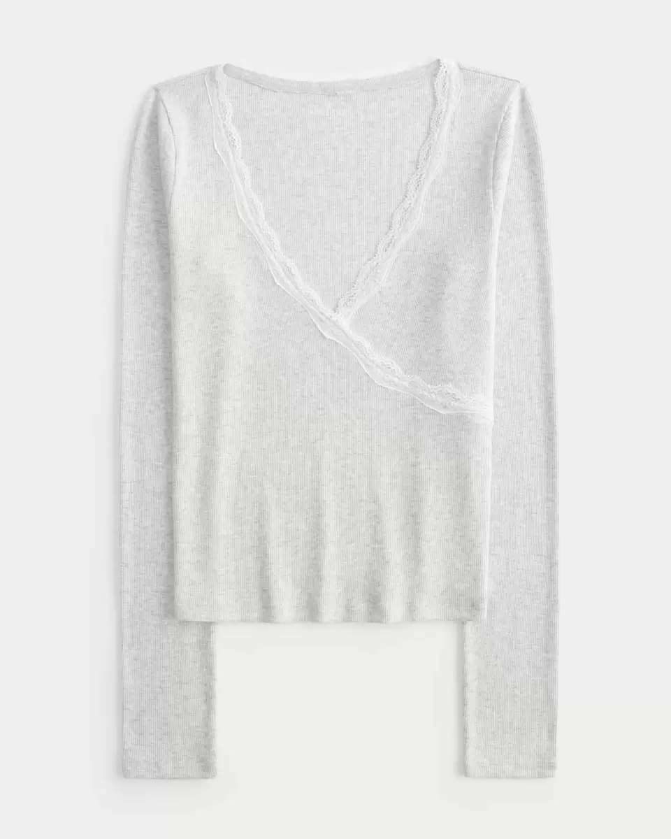Supermiękka bluzka z długim rękawem i dekoltem w serek w stylu kopertowym, wykończonym śliczną koronką. Dopasowany krój. Produkt importowany.