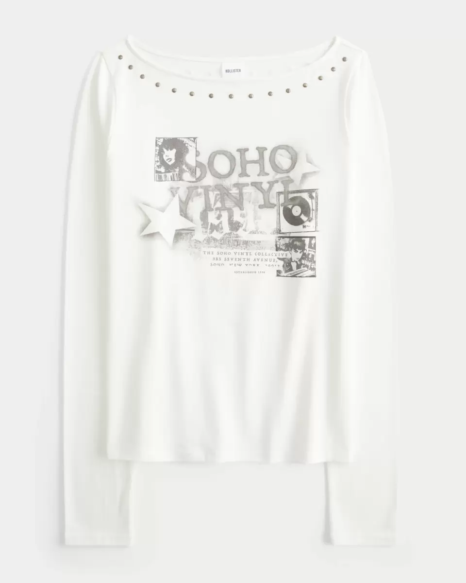 Uroczy i supermiękki top z długim rękawem ozdobiony jest grafiką SoHo i ćwiekami wzdłuż dekoltu. Dopasowany krój. Produkt importowany.