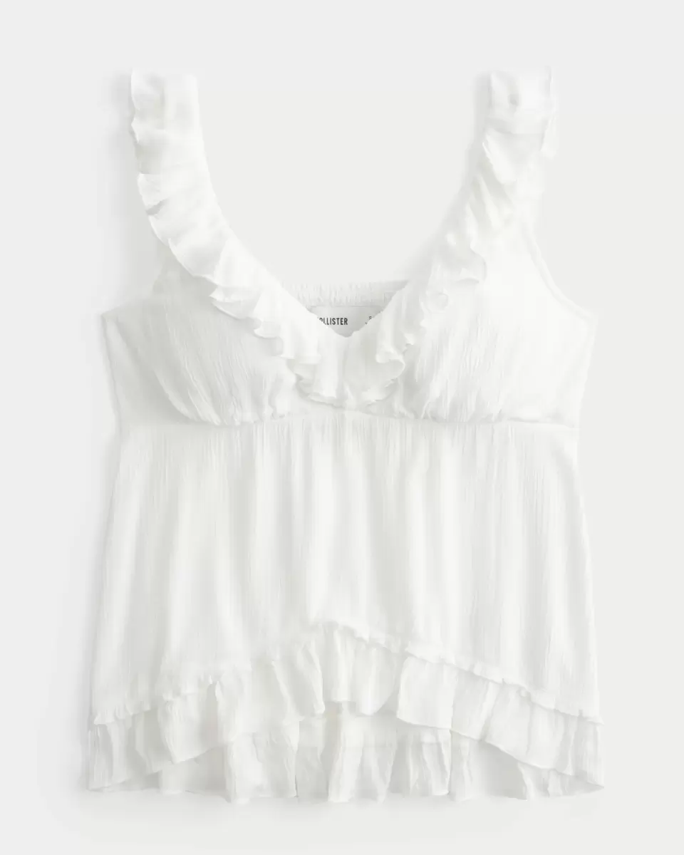 Lekka i supermiękka, ta bluzka w stylu boho jest wykonana z marszczonego materiału i ozdobiona falbankami oraz falbaniastymi ramiączkami. Miękkie marszczenie na plecach, idealnie sprawdzi się zarówno na co dzień, jak i na elegancko! Łatwe dopasowanie. Importowane.