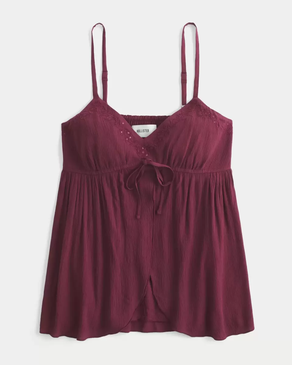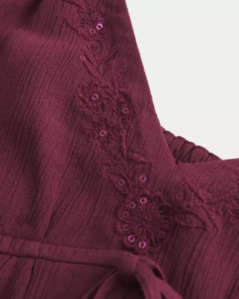 Lekka i supermiękka, ta bluzka typu babydoll jest wykonana z marszczonego materiału i ozdobiona haftowanym wykończeniem wzdłuż dekoltu z pięknymi, błyszczącymi detalami. Luźny krój, regulowane ramiączka, wiązanie na środku. Importowane.