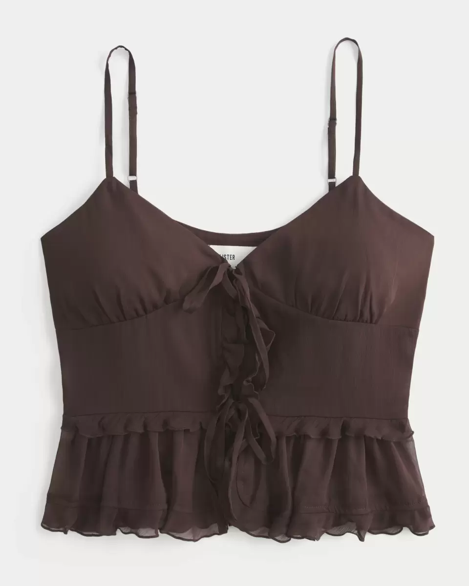 Ta śliczna koszulka na ramiączkach wykonana jest z supermiękkiego szyfonu i ma falbaniaste detale. Wiązanie pośrodku, regulowane ramiączka. Importowane.
