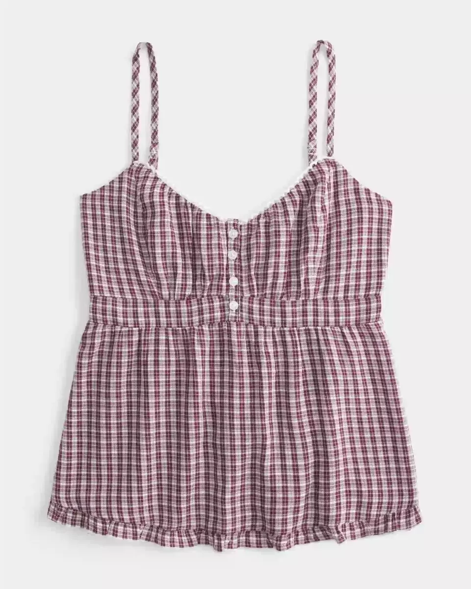 Lekka i supermiękka, ta bluzka typu babydoll ma guziki na środku, falbankę wzdłuż dekoltu i falbankę u dołu. Regulowane ramiączka. Produkt importowany.