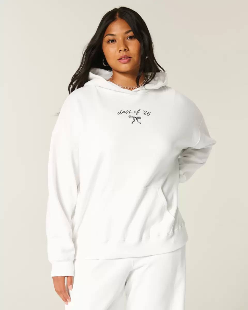 Supermiękka bluza z kapturem z polaru z haftem graficznym z 2026 roku. Kaptur, kieszeń kangurka z przodu, długie rękawy. Luźny krój. Importowane.