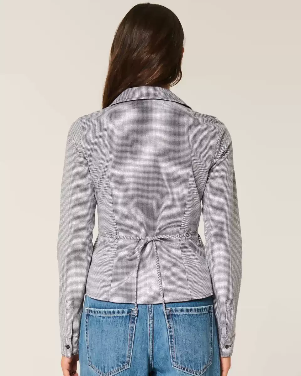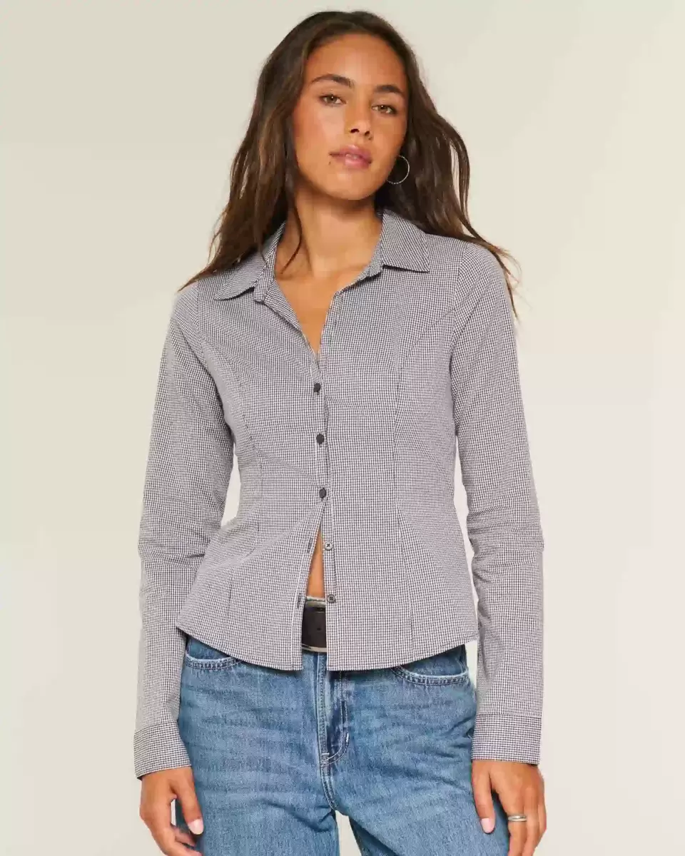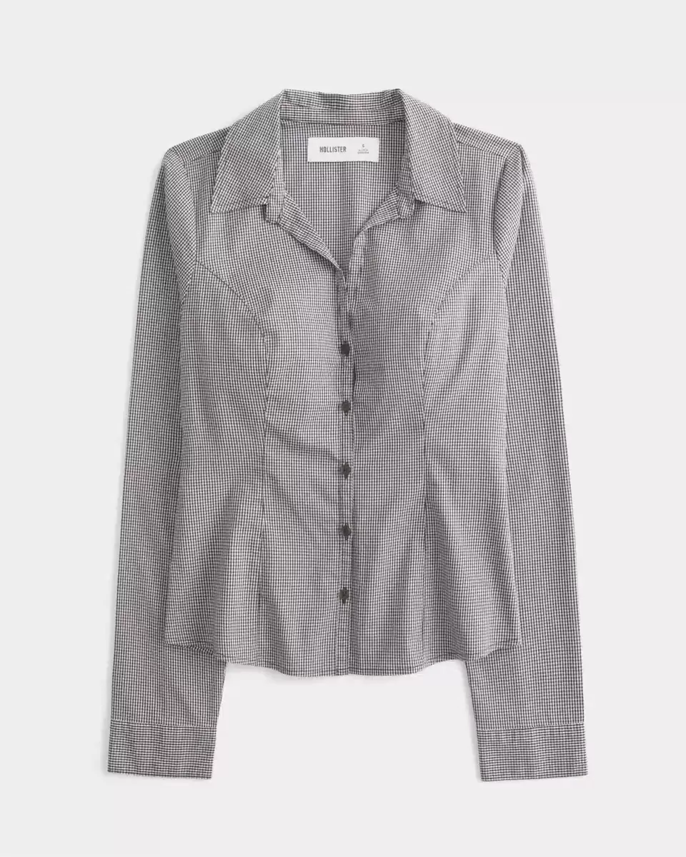 Koszula z elastycznej popeliny z długim rękawem, inspirowana Y2K, zapinana na guziki i wykończona szwami. Kołnierzyk, regulowane wiązanie z tyłu dla idealnego dopasowania. Idealnie wygląda zarówno na co dzień, jak i na elegancko! Dopasowany krój. Importowane.