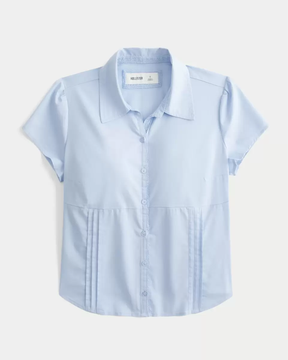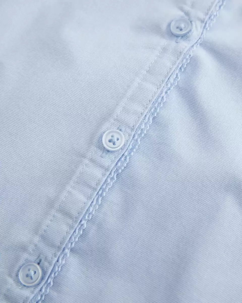 Koszula z krótkim rękawem, zapinana na guziki, inspirowana Y2K, wykonana z elastycznej popeliny, z drobnymi zakładkami i koronkowymi detalami wzdłuż zapięcia na guziki. Wiązanie z tyłu, idealna zarówno na eleganckie okazje, jak i na co dzień! Dopasowany krój. Importowane.