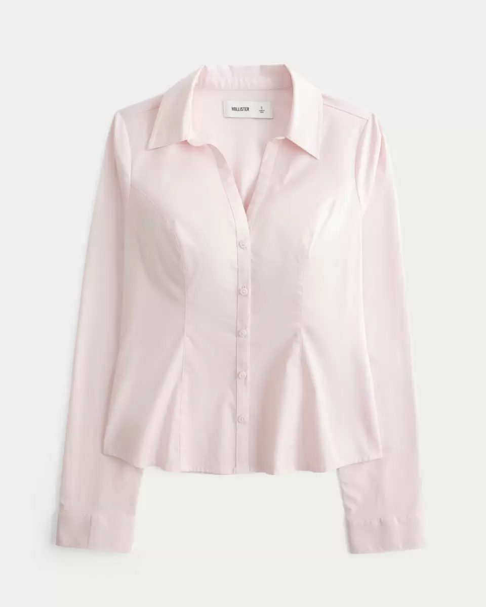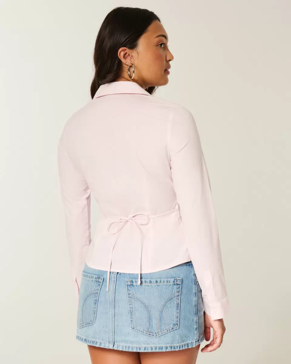 Inspirowana Y2K, dopasowana koszula z elastycznej popeliny z długim rękawem, kołnierzykiem, szwami i regulowanym wiązaniem z tyłu. Zapięcie na guziki. Dopasowany krój. Produkt importowany.