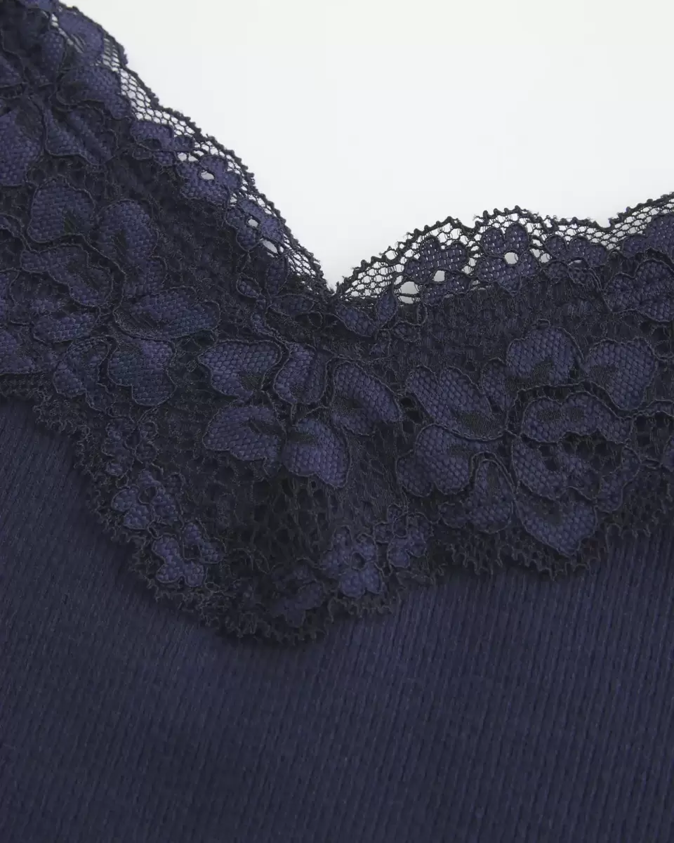 Piękna i supermiękka koszulka na ramiączkach inspirowana Y2K z koronkowymi wykończeniami przy dekolcie i u dołu. Regulowane ramiączka. Dopasowany krój. Produkt importowany.