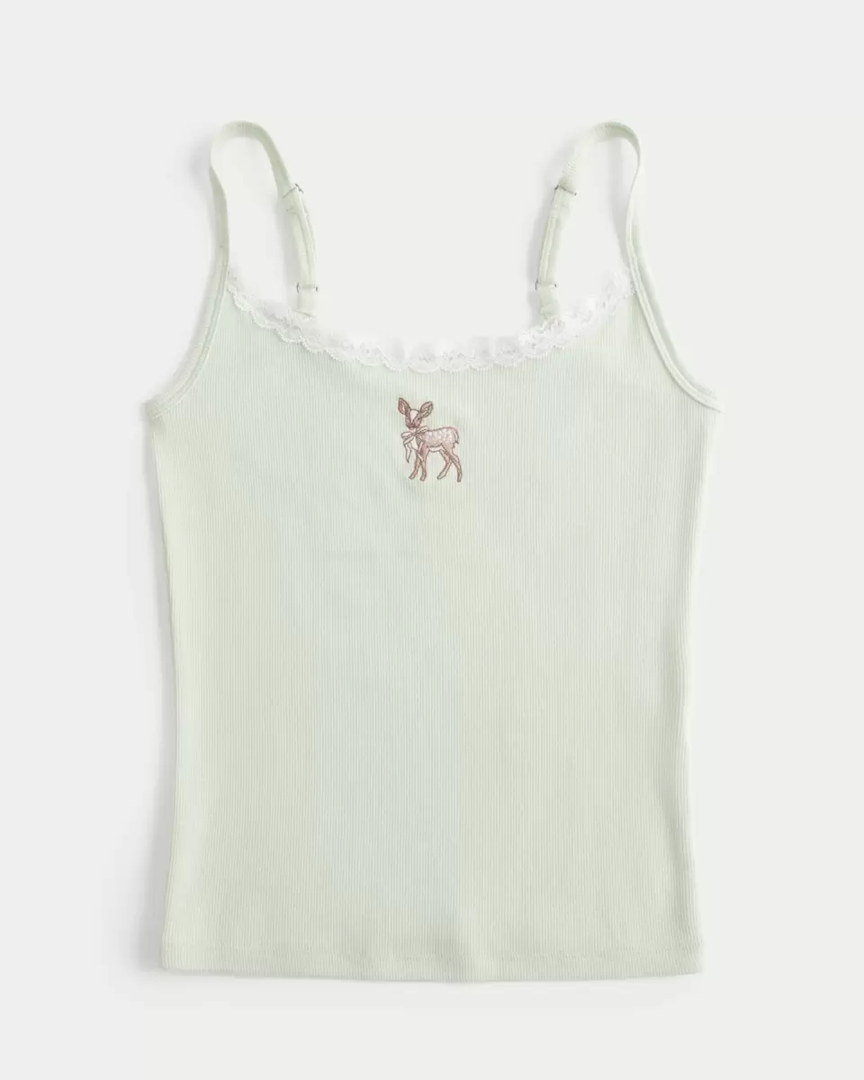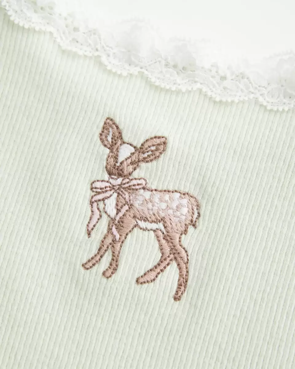 Ten uroczy i wygodny top ma śliczną koronkową lamówkę przy dekolcie i haftowany motyw jelenia. Supermiękki, prążkowany materiał, regulowane ramiączka. Dopasowany krój. Produkt importowany.