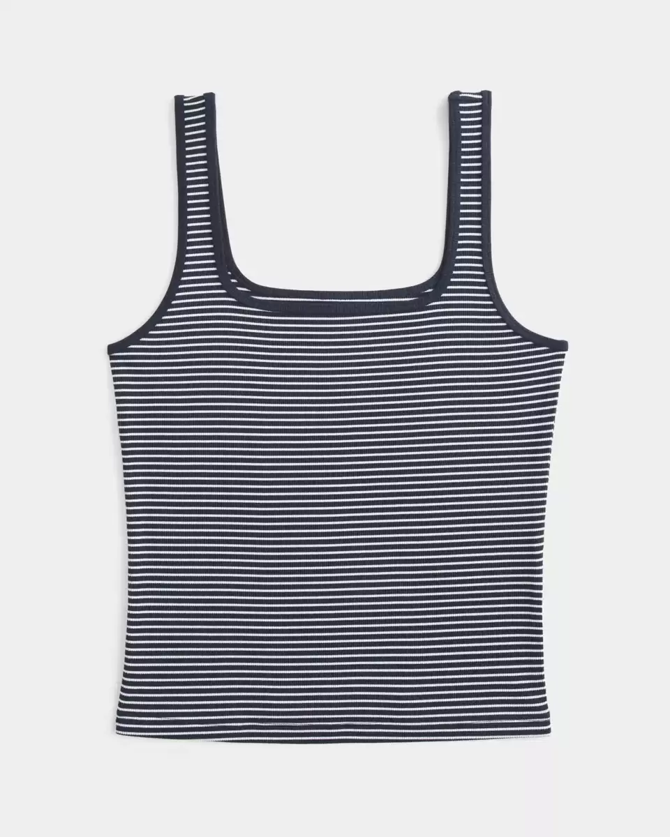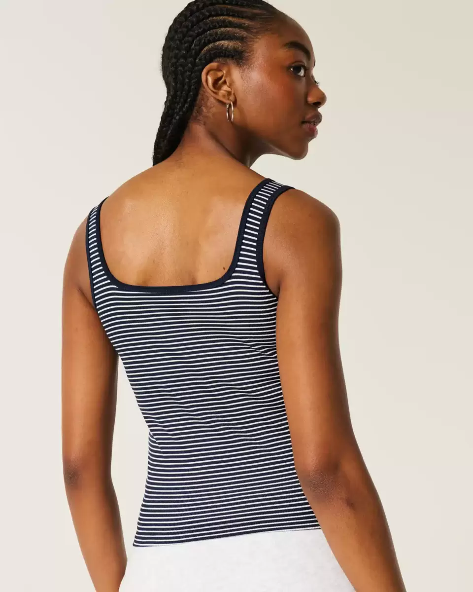 Wygodny top z prążkowanej tkaniny o bezszwowym wyglądzie i fakturze, zaprojektowany z kwadratowym dekoltem. Dopasowany krój. Produkt importowany.