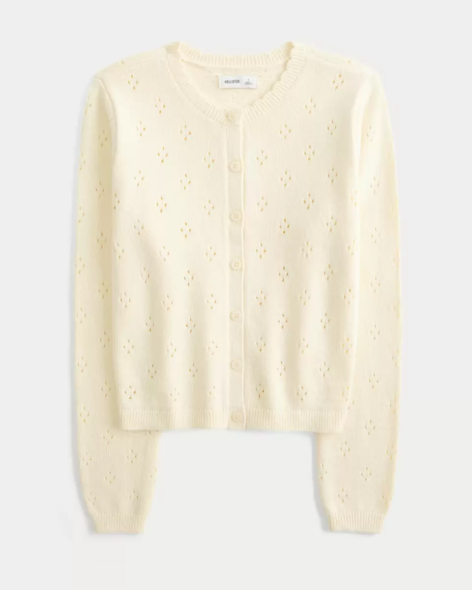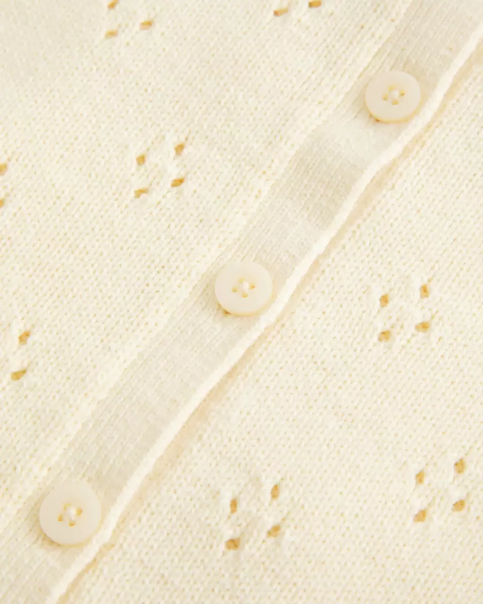 Przytulny i supermiękki kardigan z ładnym wzorem z oczkami na całej powierzchni i okrągłym dekoltem w kształcie muszelki. Zapięcie na guziki na całej długości, ściągacze, długie rękawy. Produkt importowany.